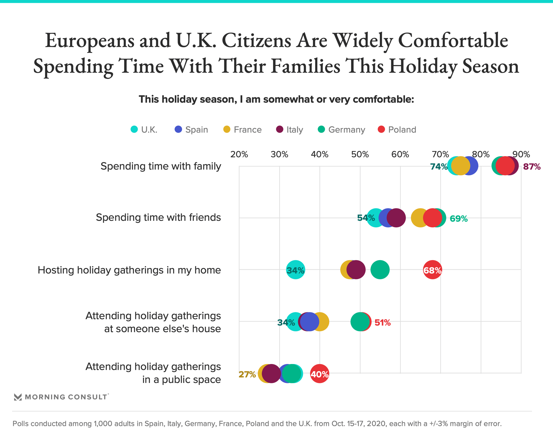 Across markets, citizens are widely comfortable spending time with their family this holiday season, though comfort levels start to differ around spending time with friends (just over half of those in the United Kingdom, Spain and Italy are somewhat or very comfortable with this, while more than 6 in 10 are in other markets).
