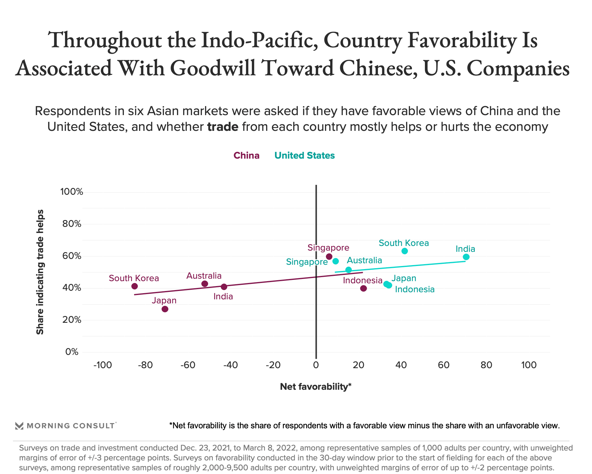 To the extent that these patterns hold across the broader Indo-Pacific region, U.S. and Chinese companies doing business there should anticipate easier market access and business opportunities where favorability toward their country is high, and greater headwinds otherwise. This is good news given that foreign trade and capital flows have historically been hot-button issues in the Indo-Pacific and elsewhere.