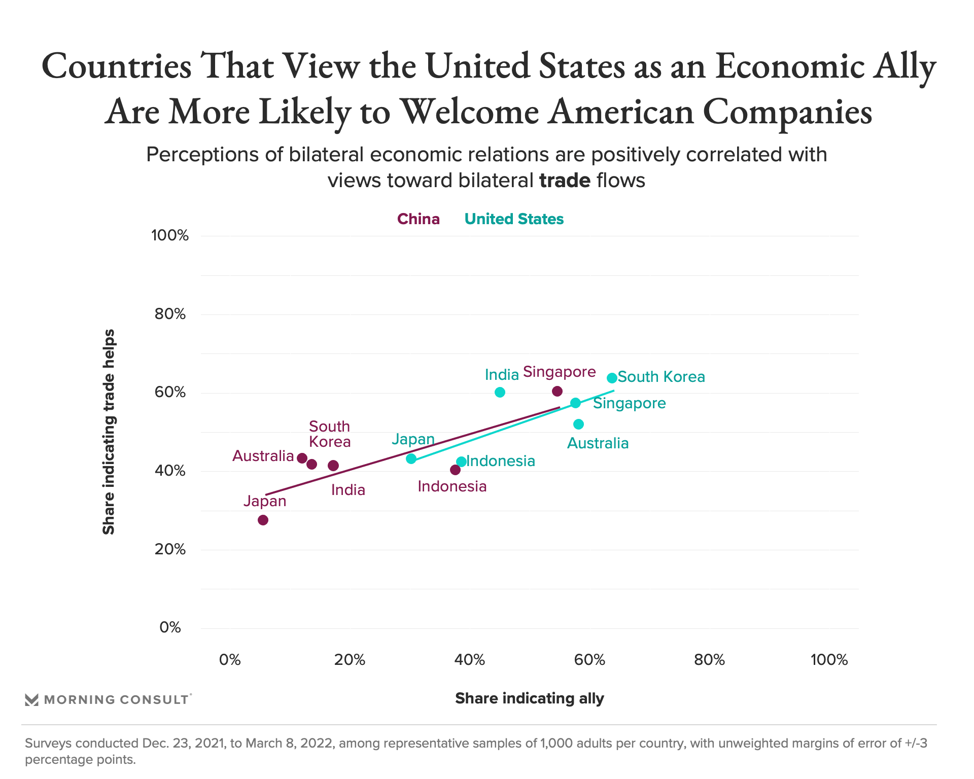 Our data on Indo-Pacific sentiment toward trade and investment flows involving American and Chinese companies suggests this is the case. Specifically, across six of the region’s larger markets — Australia, India, Indonesia, Japan, Singapore and South Korea — public perceptions that U.S. and Chinese trade and investment flows are mostly beneficial are positively associated with net favorability toward each country.