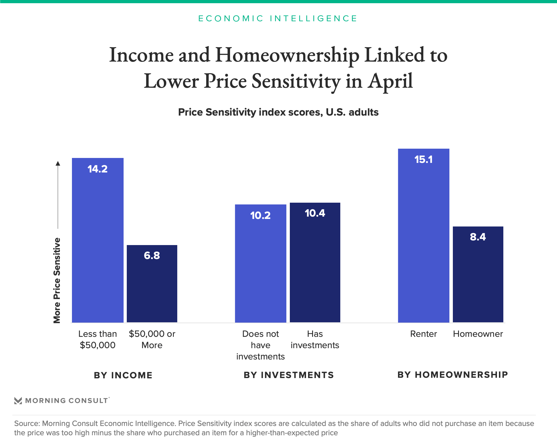 Homeowners and those with invested assets have benefited tremendously over the last two years from rising home and equity prices, experiencing the classic wealth effect supporting their spending habits. There are signs, however, in the Morning Consult data that this may be changing based on recent stock market declines. In April, adults with investments — typically an indication of higher wealth — exhibited slightly higher price sensitivity than adults with no investments. Although invested assets are not necessarily liquid, they imply some manner of safety net, akin to a savings buffer, for adults who have them. Consumers watching their stock market portfolios shrink are finding themselves less well off than they expected, and act accordingly in their spending.