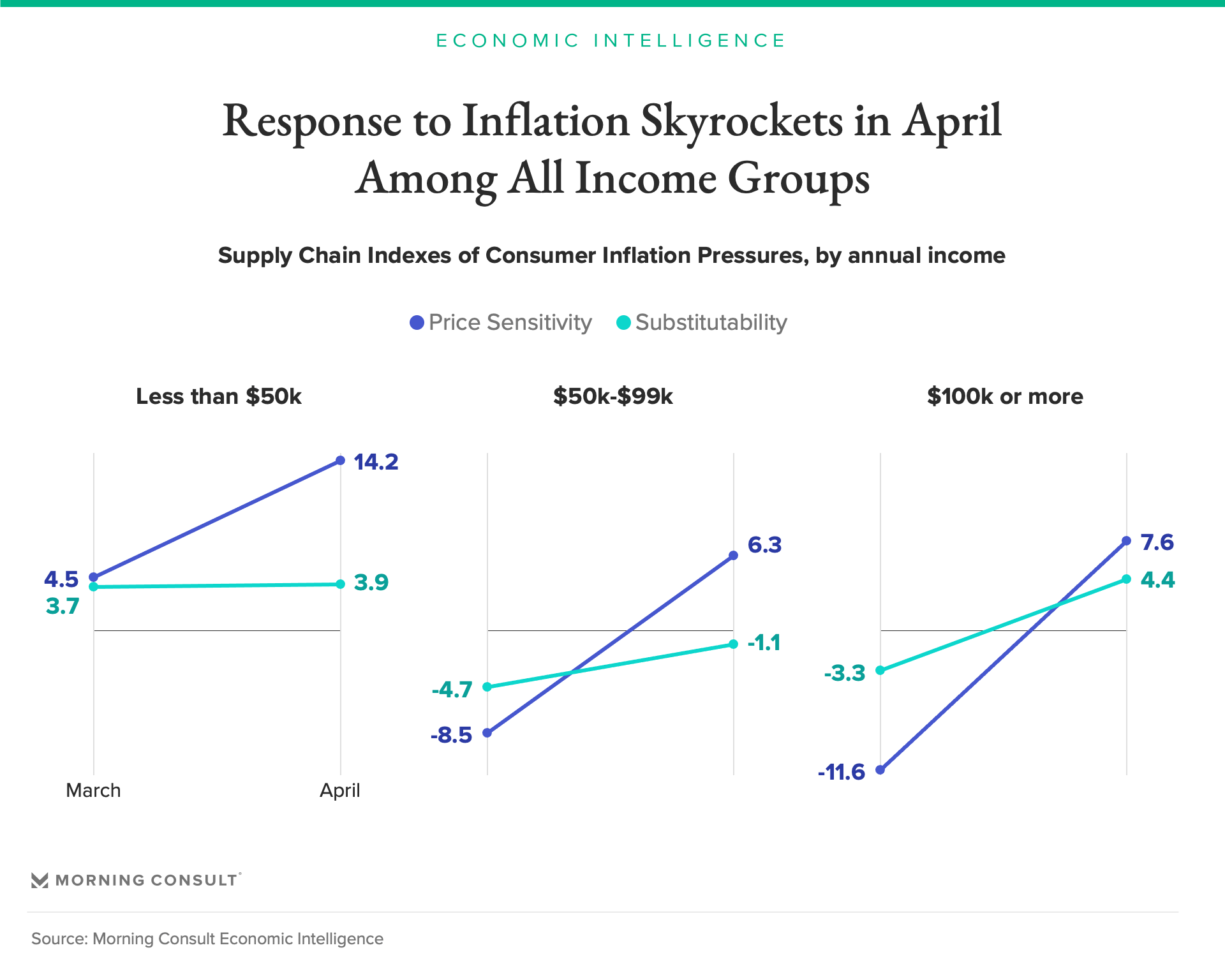 Morning Consult’s newest indexes demonstrate that income inequality is playing an important role in consumers' response to inflation: With inflation tightening its grip on household budgets in April, consumers reported increases in both price sensitivity (measured as the willingness to forgo a purchase when faced with sticker shock) and substitutability (measured as the willingness to trade down to a cheaper substitute).