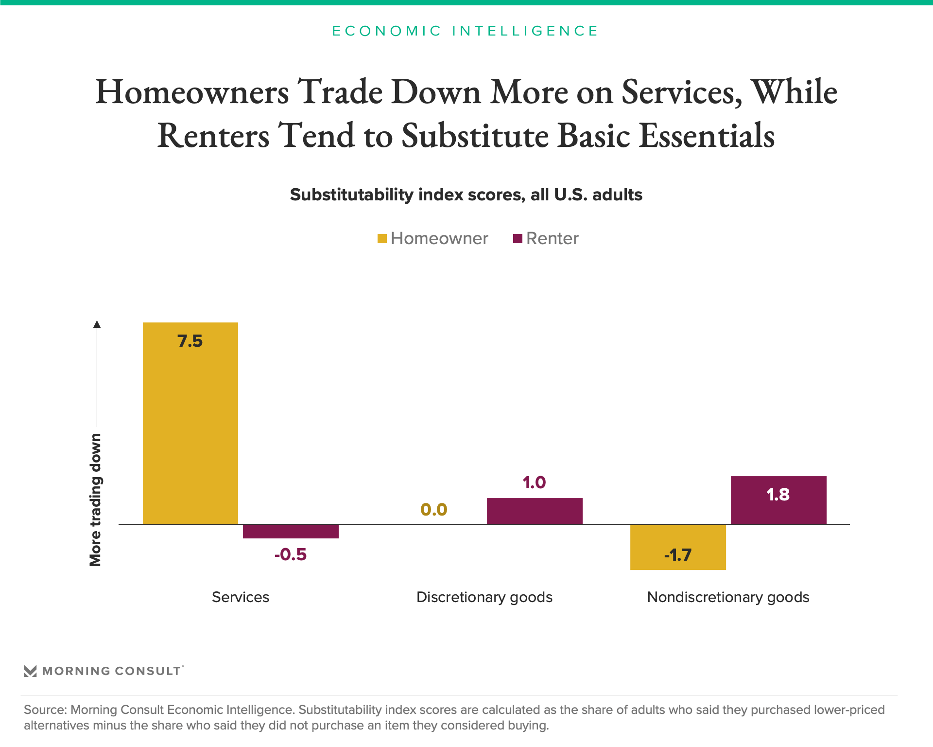 In addition to home values, which are making down payments harder to afford, the growing cost burden from higher mortgage rates may be forcing prospective buyers to opt for lower-priced homes than they originally sought. Renters, meanwhile, were more likely to trade down on essential goods like groceries or personal care items.