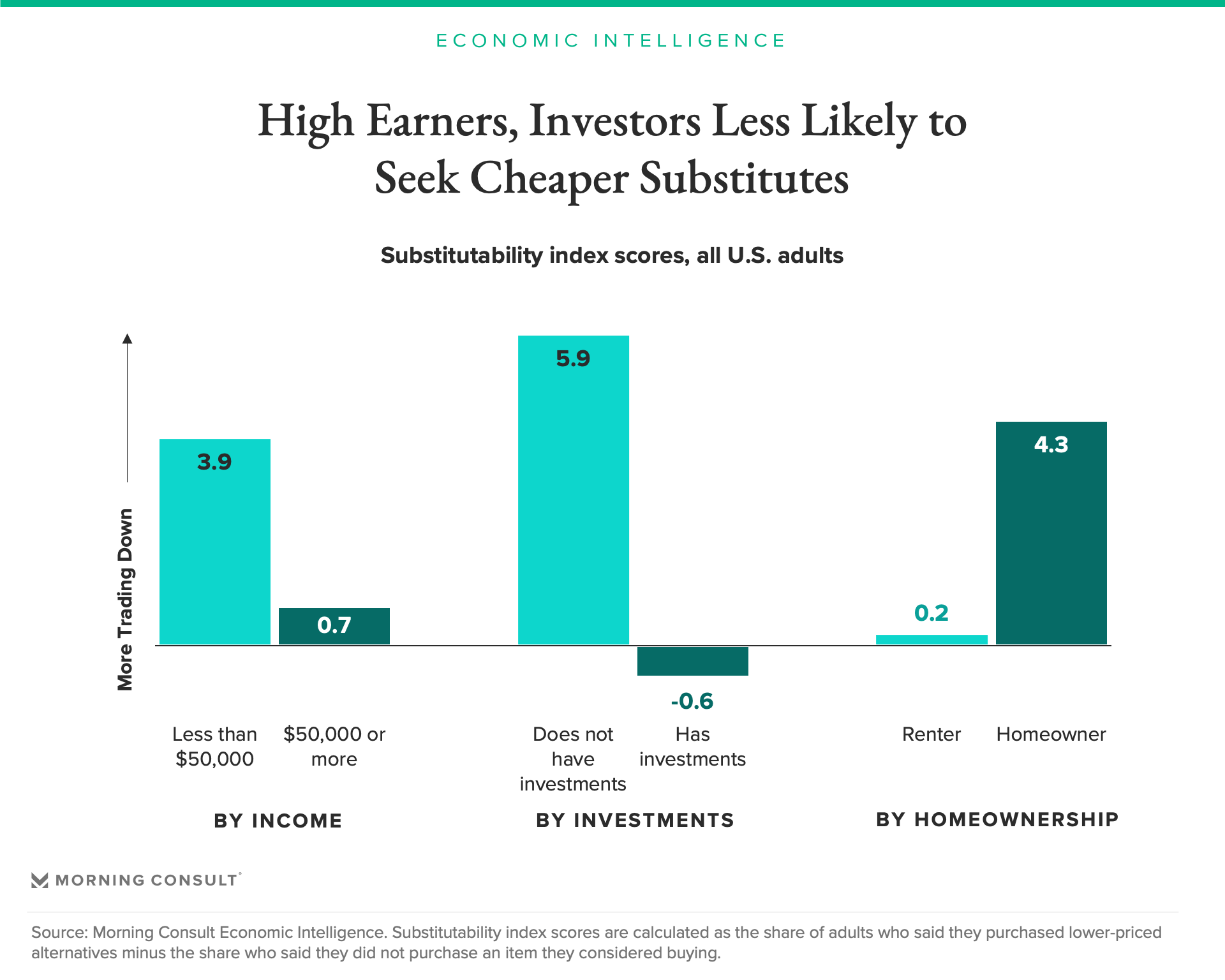 Additionally, adults from higher-income households and those who said they owned investments were less likely to report having opted for cheaper alternatives when purchasing goods and services last month.