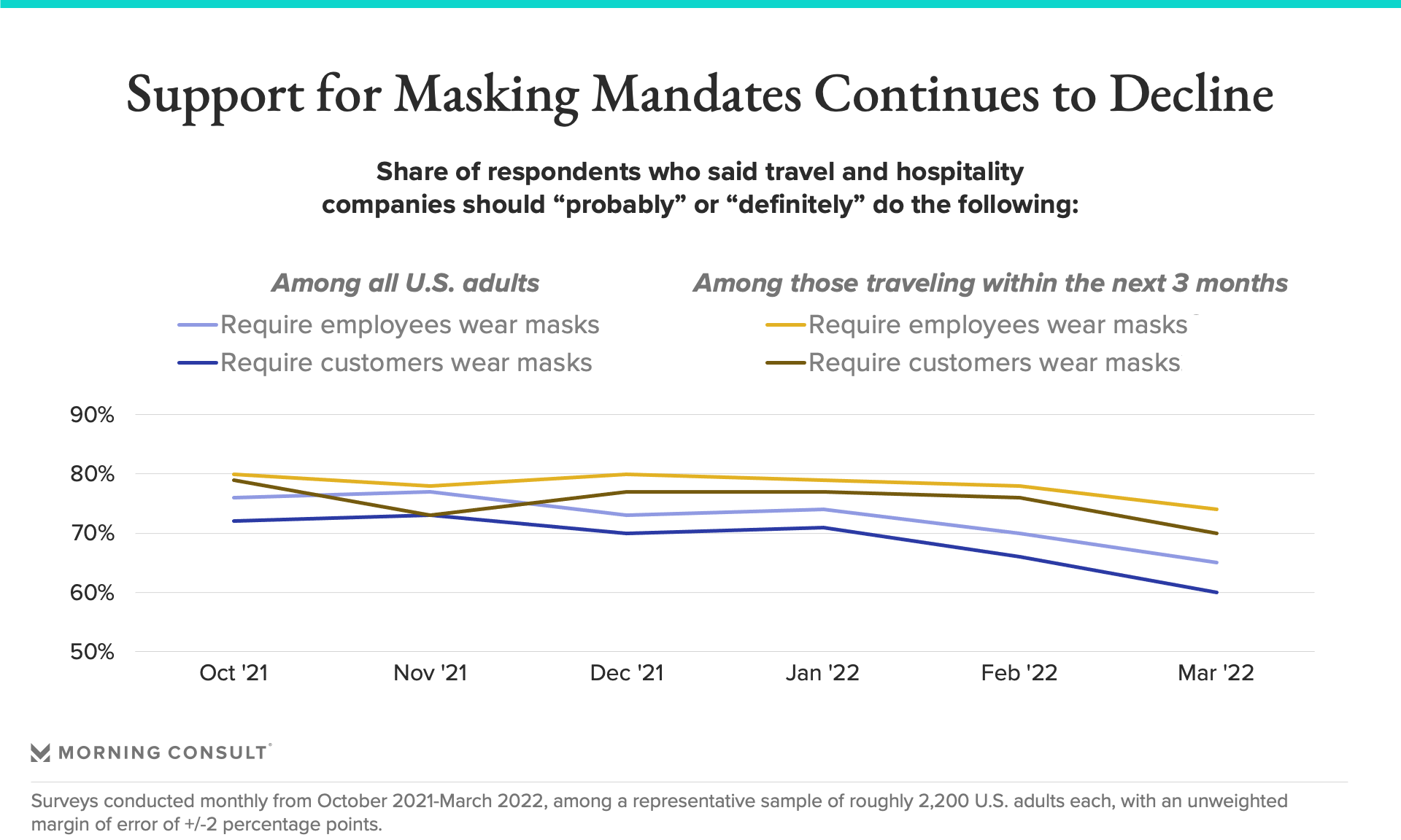 But these figures have slipped: General support for requiring customers to wear face coverings has dropped 11 percentage points since January 2022, while backing for an employee mask mandate has dropped 9 points during that time. If these trends continue, support will remain above 50% in April.