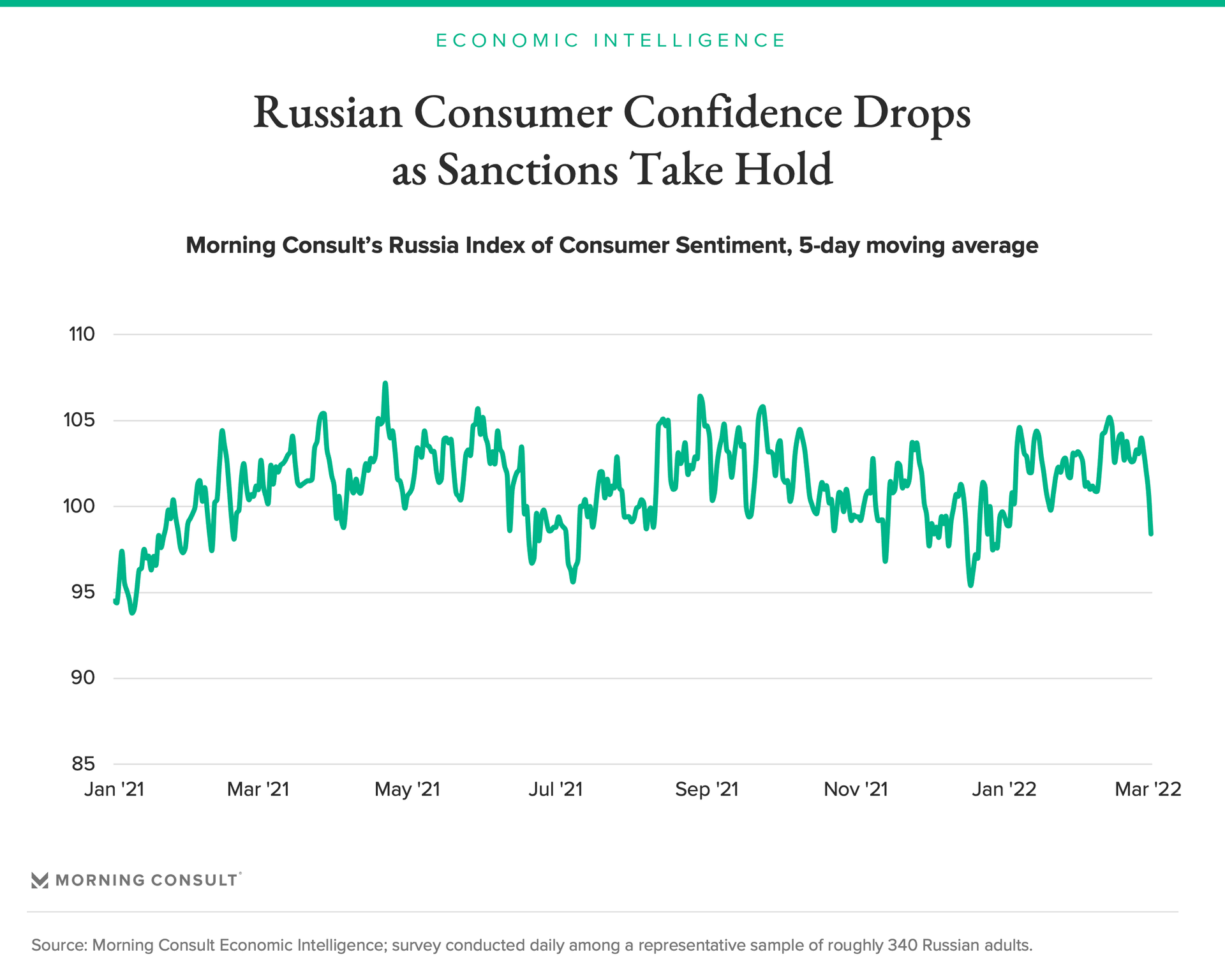 Increasingly severe sanctions imposed by the United States, Europe and other governments and entities around the world have begun to take a heavy toll on the Russian economy. The resultant hardships are now weighing on consumer confidence, with Morning Consult’s Russia Index of Consumer Sentiment falling 5.6 percent, from 104 on Feb. 26 to 98.4 on March 2, marking the lowest point so far this year.