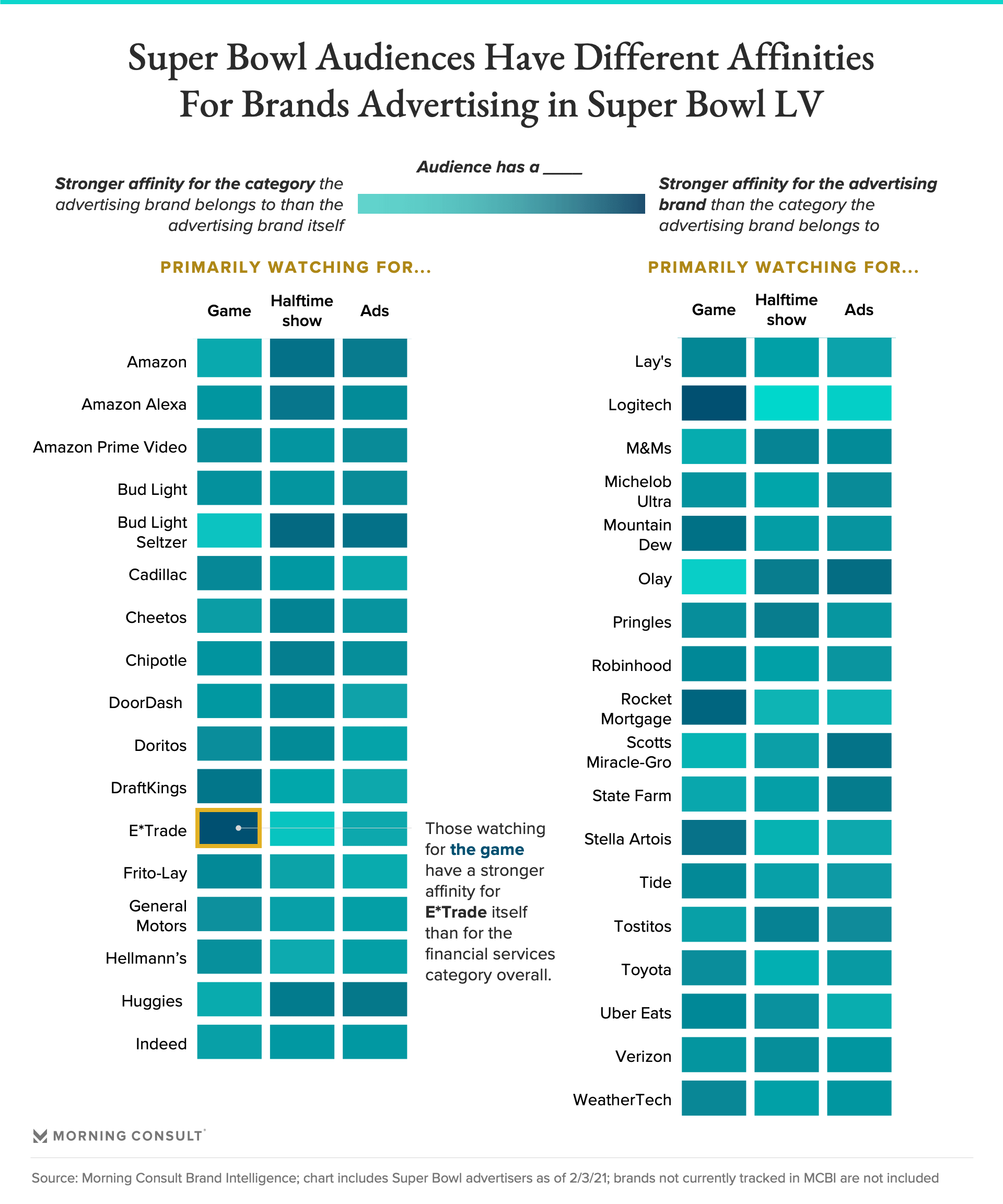 Using Morning Consult Brand Intelligence, we explored the Super Bowl audiences that brands are most likely to find success with, whether they’re watching for the game, the halftime show or the commercials.