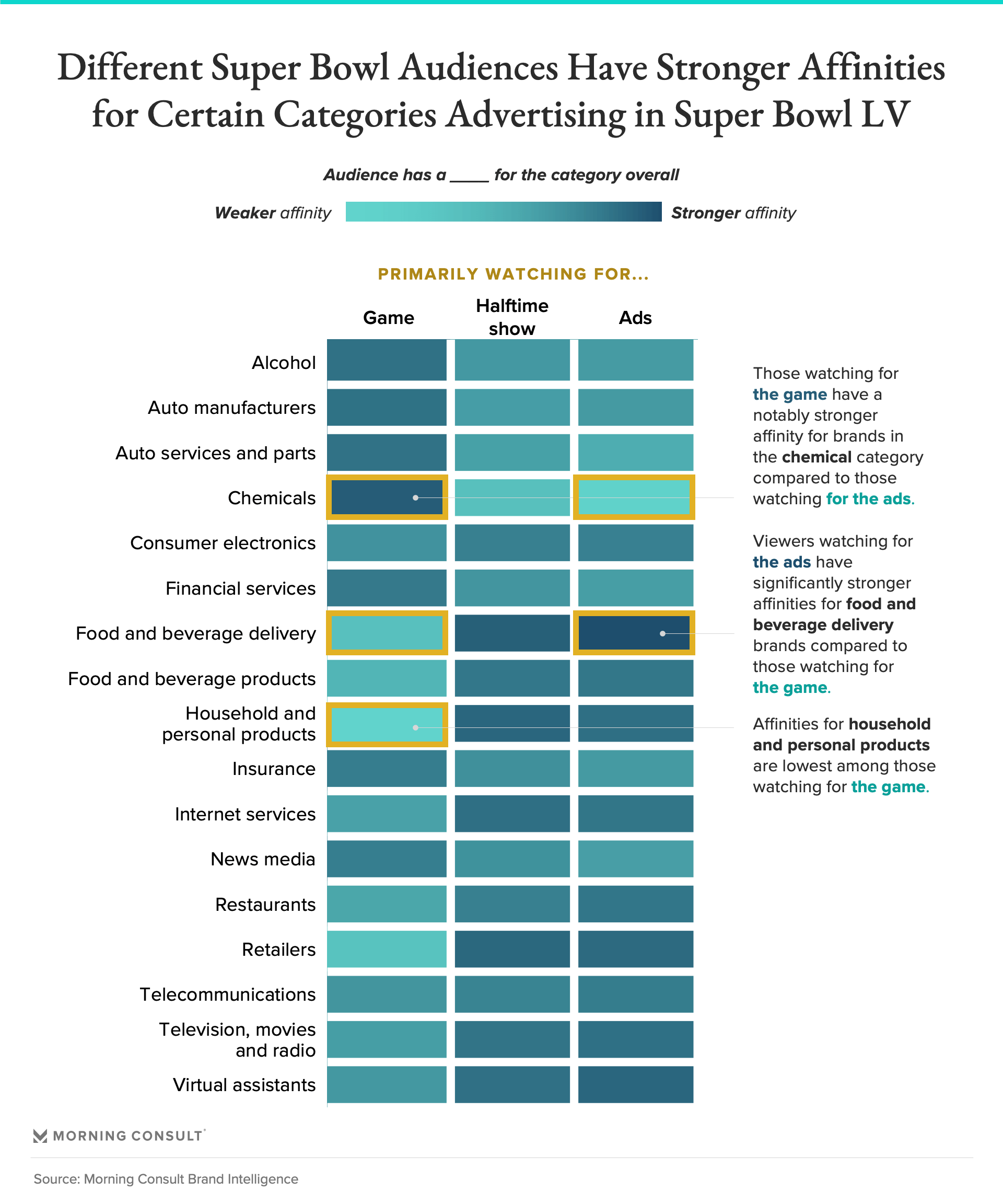 However, the Super Bowl’s different audiences, defined by the primary reason respondents are tuning in, mean there’s a wide spectrum of affinity for the key categories and the brands advertising during the biggest game of the year.