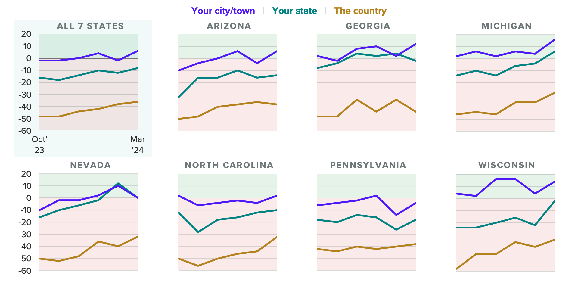 The average swing-state voter is less likely to say the country’s economy is on the wrong track than they were five months ago, though sentiment remains underwater. However, for the second time in our tracking, economic sentiment is above water at the local level — something that’s especially true in the Upper Midwest.