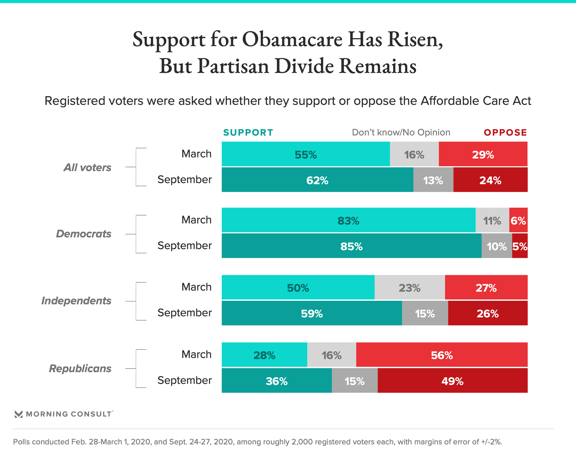 8) 62%: The share of voters who support the Affordable Care Act, former President Barack Obama’s signature health law. That level of backing, measured in September, was up 7 percentage points from the first quarter of the year.