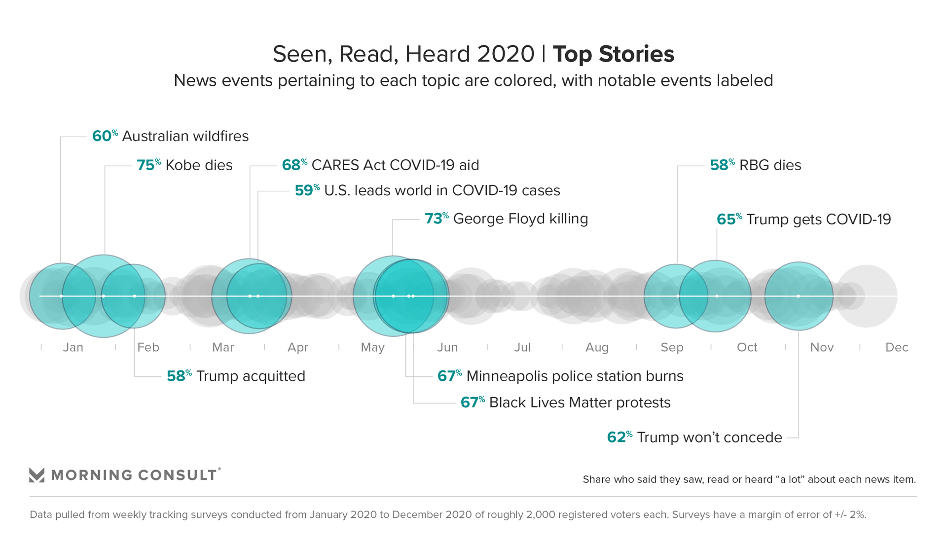 10) 75%: The share of voters who heard “a lot” about Kobe Bryant’s death. The tragedy in January was 2020’s top news event in terms of public awareness, though nearly as many (73 percent) reported hearing a lot about the killing of George Floyd.