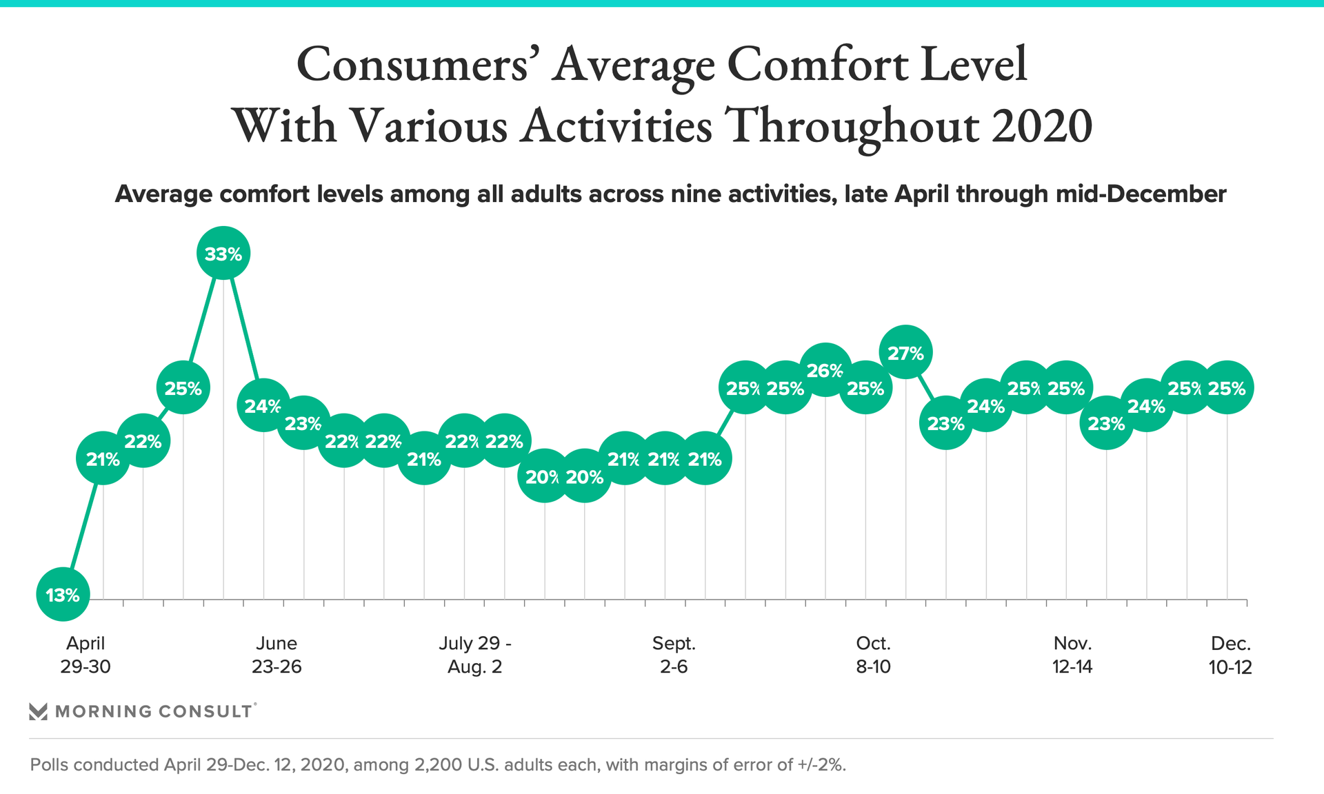 12) 25%: The percentage of the public that on average currently feels comfortable doing a number of leisure activities, from dining out to going to the mall. Comfort levels have not changed dramatically in recent months, but the vaccine will likely turn the tide.