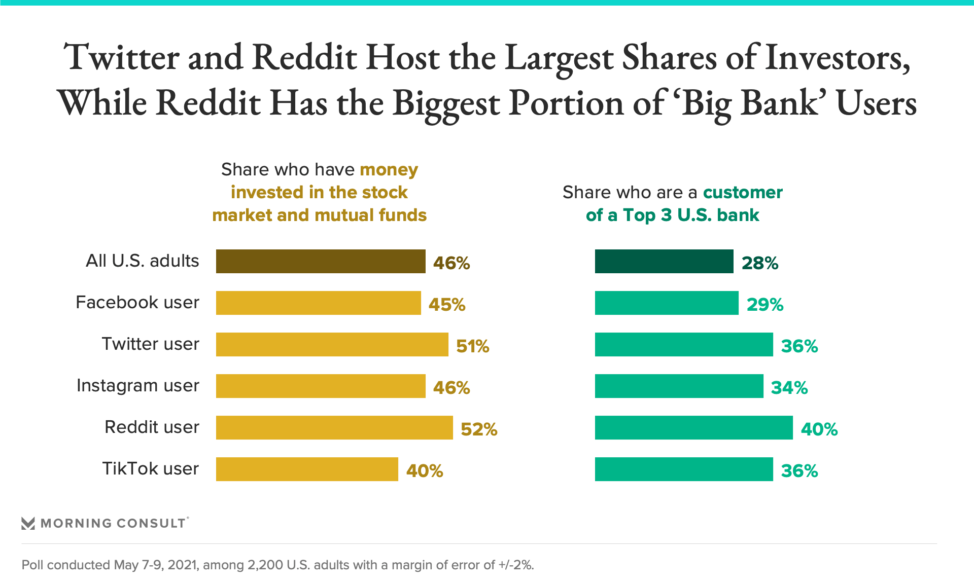 - Twitter and Reddit house the largest shares of investors on their platforms, while Reddit has the biggest share of customers of the top three U.S. banks by asset size on its site.
