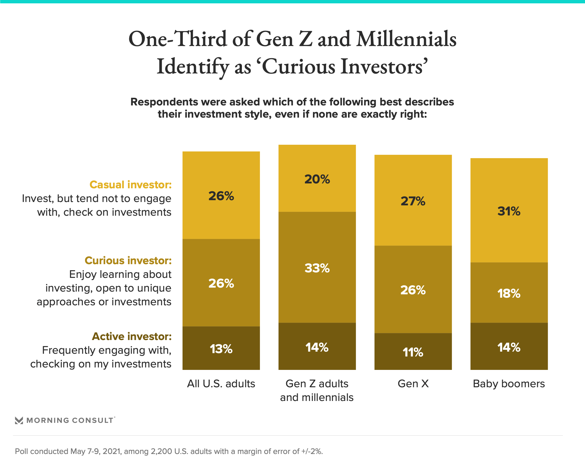 Industry leaders should be eyeing this group: One-third of Gen Z adults and millennials describe themselves as “curious” investors, who enjoy learning about investing and are open to unique approaches or investments. That malleability translates to a slew of opportunities for financial services professionals: If you can pique their curiosity and teach them something new, you may just open their wallets.
