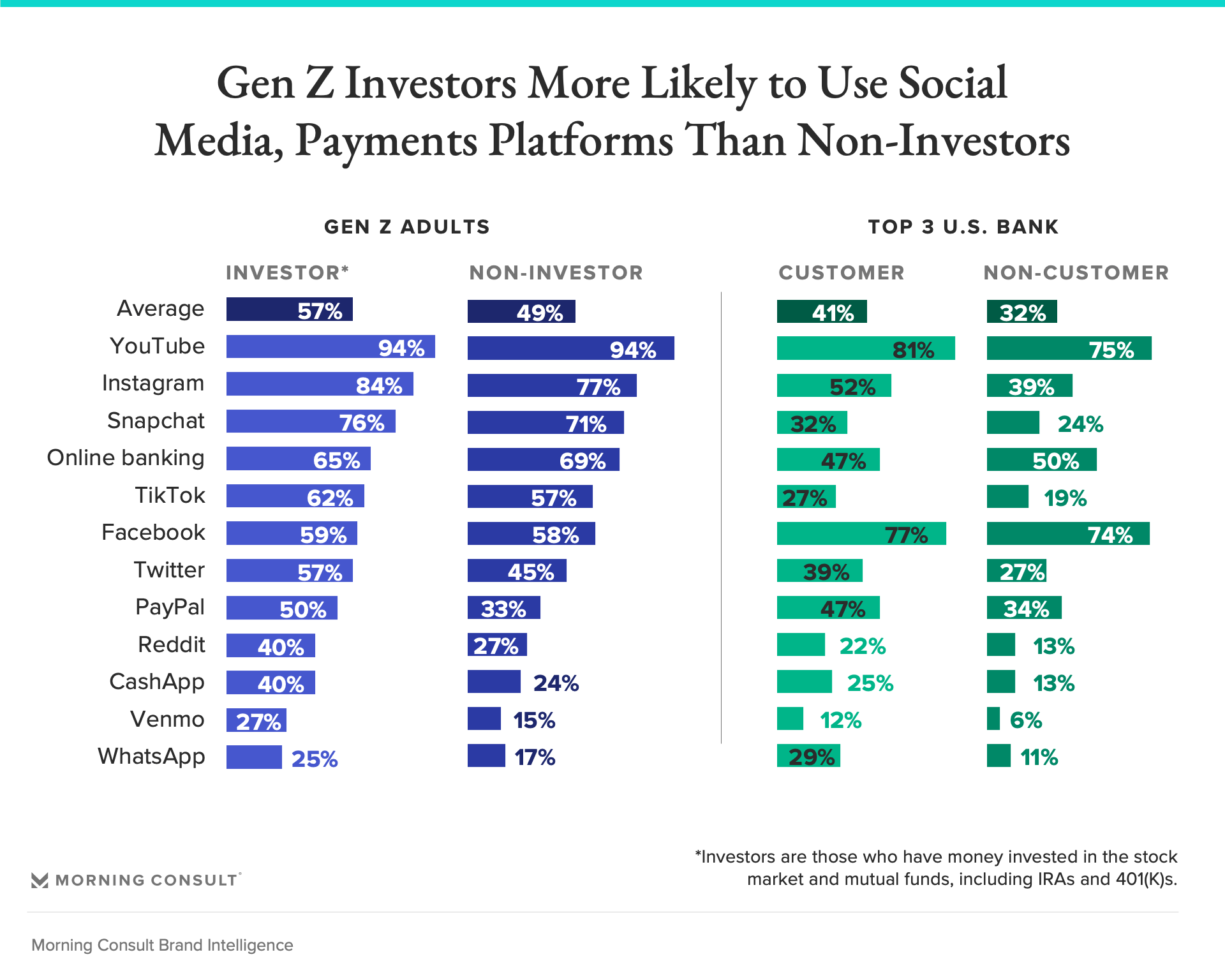 But the differences here are what’s interesting. The share of Gen Z investors that use social media is much higher than non-investors. The same is true for customers of the three largest U.S. banks.