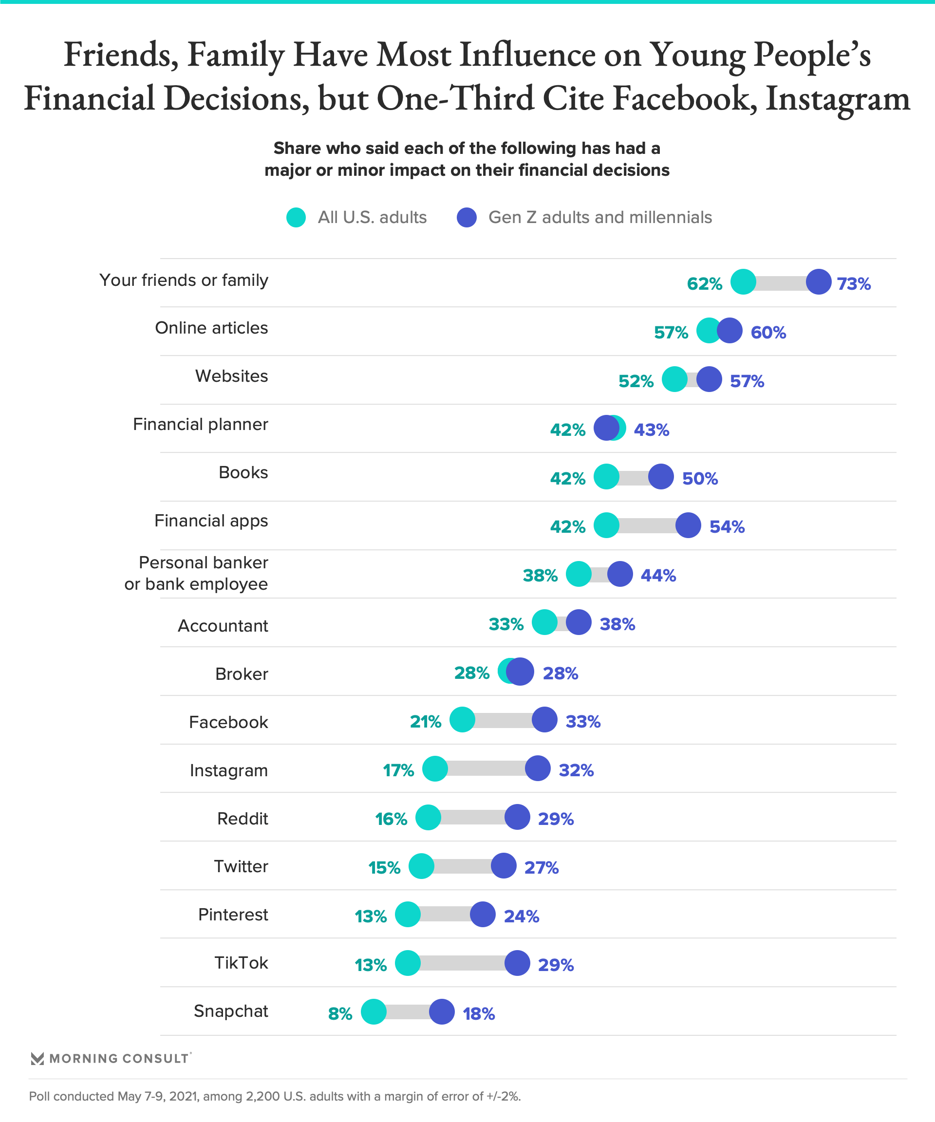 - Friends and family have the most influence on young people's financial decisions, but one-third of Gen Z adults and millennials cite Facebook and Instagram as being impactful.