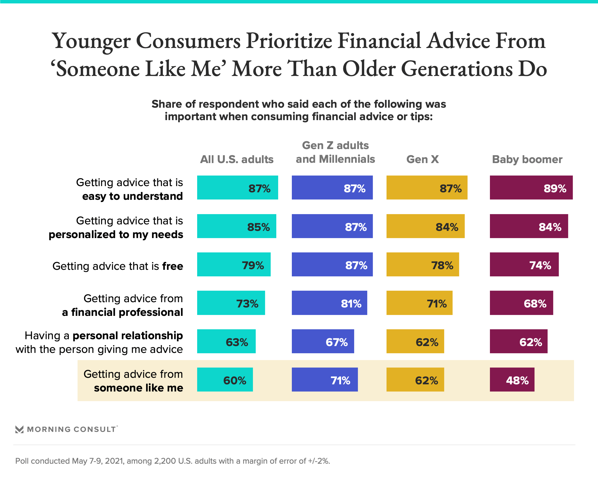Consumers’ hierarchy of needs for financial advice — easy to understand, professional or free, for example — is consistent across generations, with few differences. It’s more important to Gen Z adults and millennials that they receive financial advice from “someone like me” than it is to Gen X or Baby boomers.