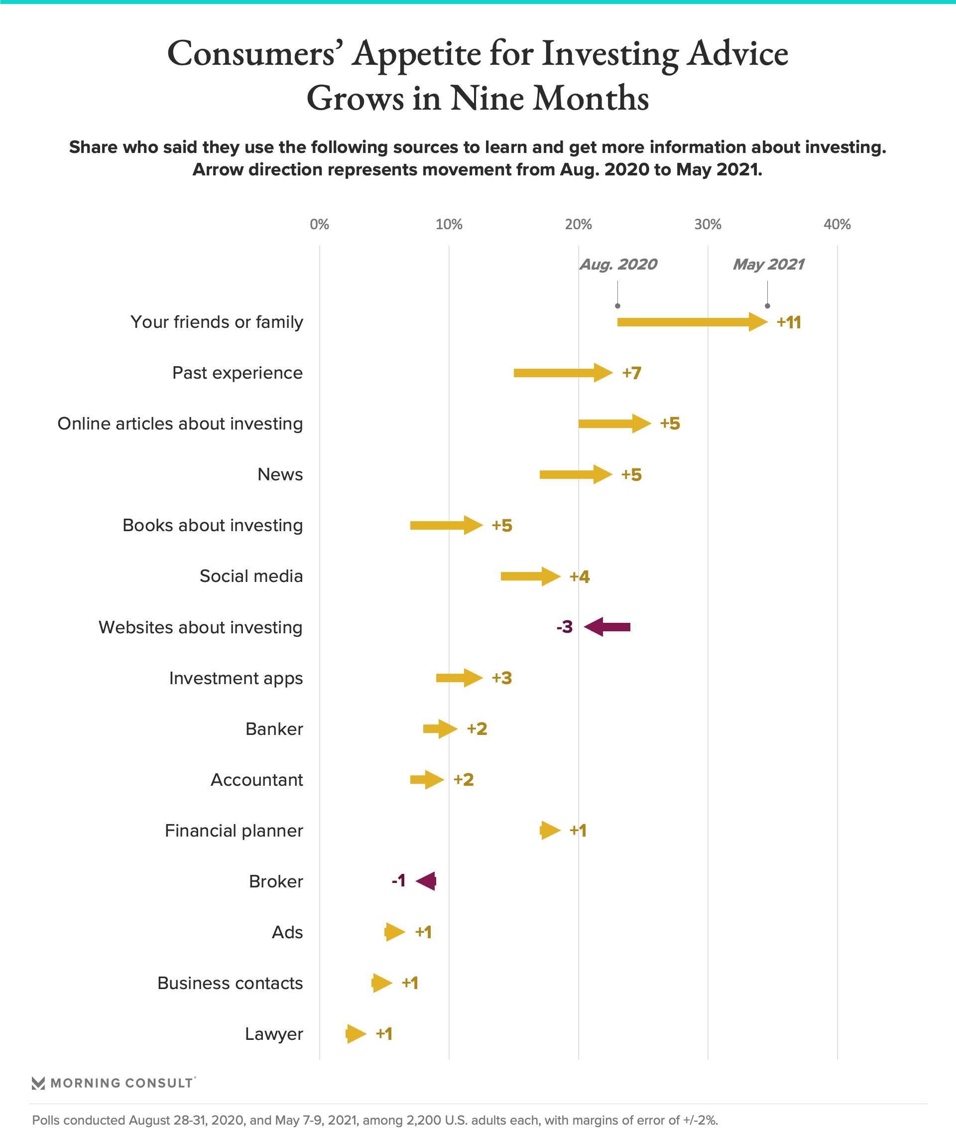 - Morning Consult polling shows more U.S. adults are using social media for investing advice, and more consider themselves investors.