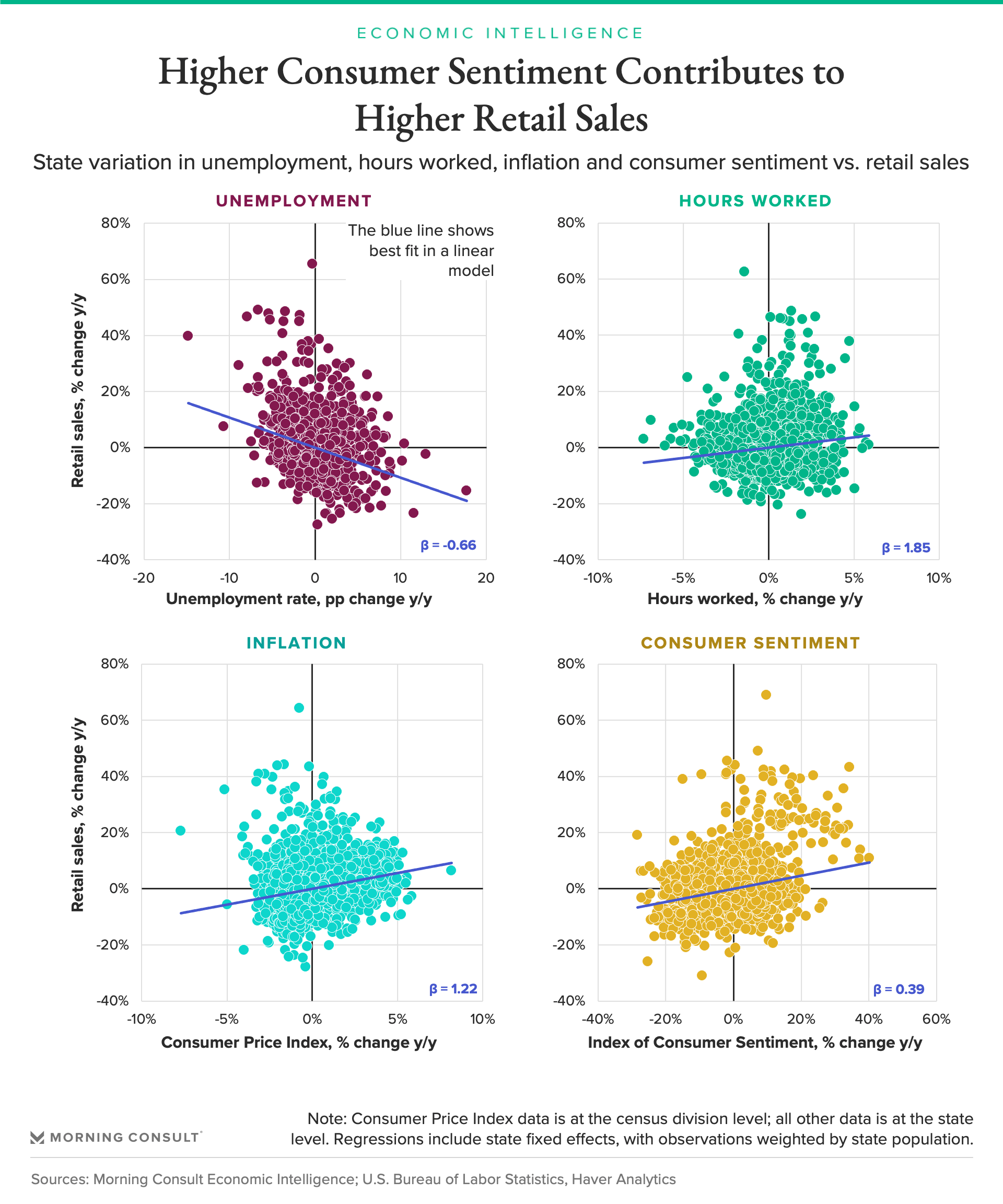 After controlling for inflation, labor market outcomes and state fixed effects in a linear regression relating retail sales to consumer sentiment, we find that a 1 percentage point year-over-year increase in Morning Consult’s Index of Consumer Sentiment correlates on average across the 50 states with a 0.4 percentage point increase in year-over-year retail sales growth.