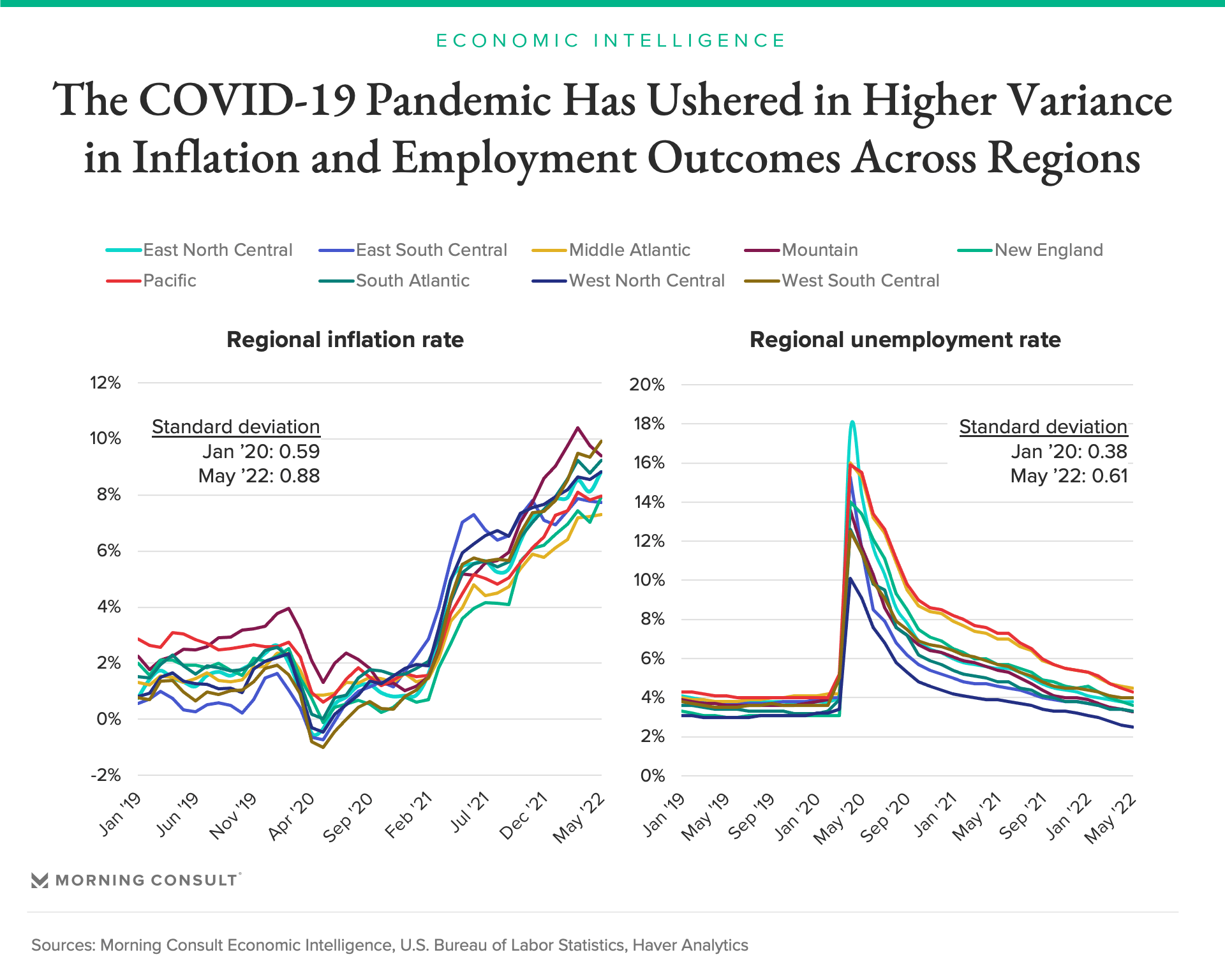 Inflation is weighing heavily on U.S. consumers. As wages fail to keep pace with rising prices, sizable differences in inflation and employment outcomes are resulting in large disparities in consumer sentiment across regions of the country.