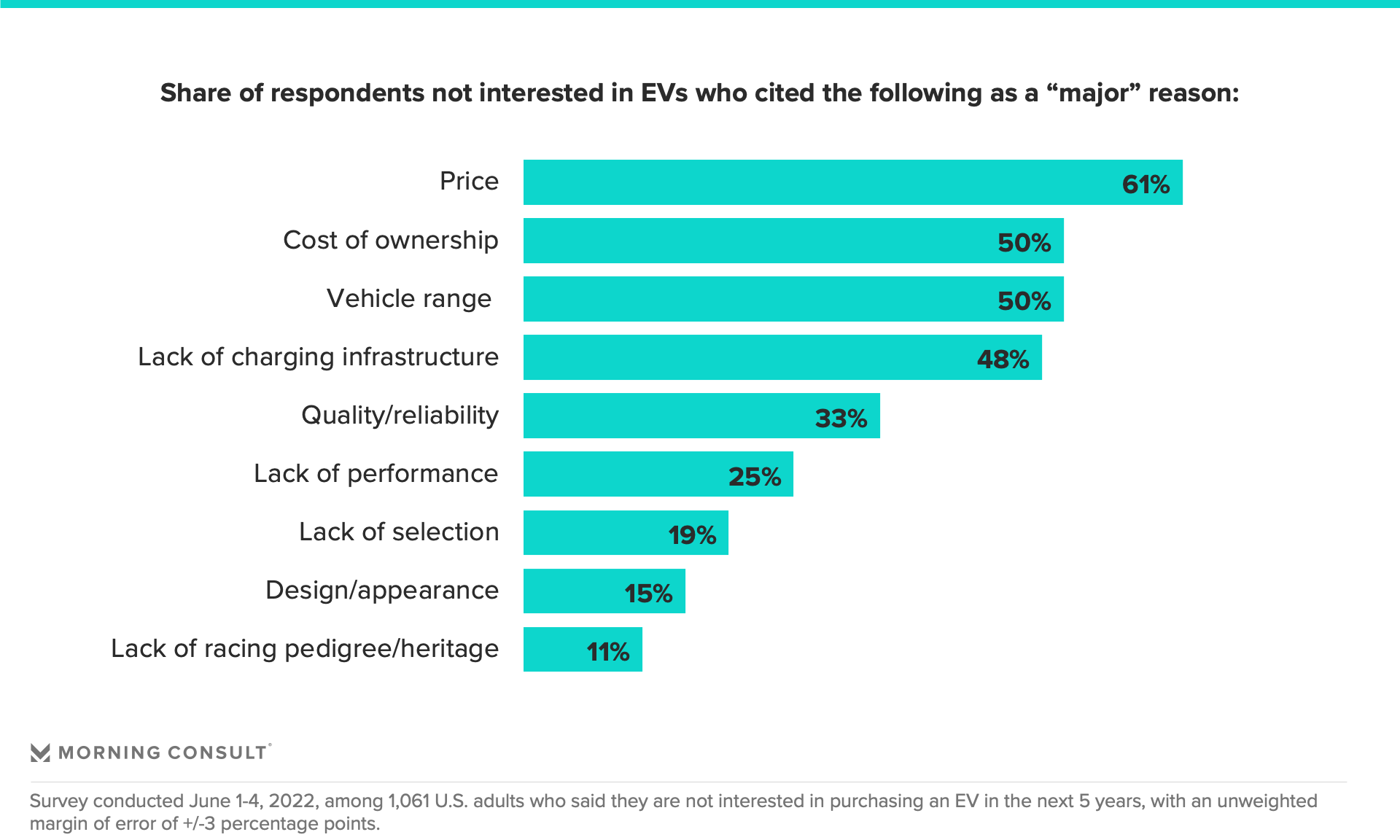 Inflation headwinds are also destroying potential purchasing power around electric vehicles, and very few are willing to pay more for EVs, even if the major inconveniences — such as the current significant lack of charging infrastructure — were to be alleviated.