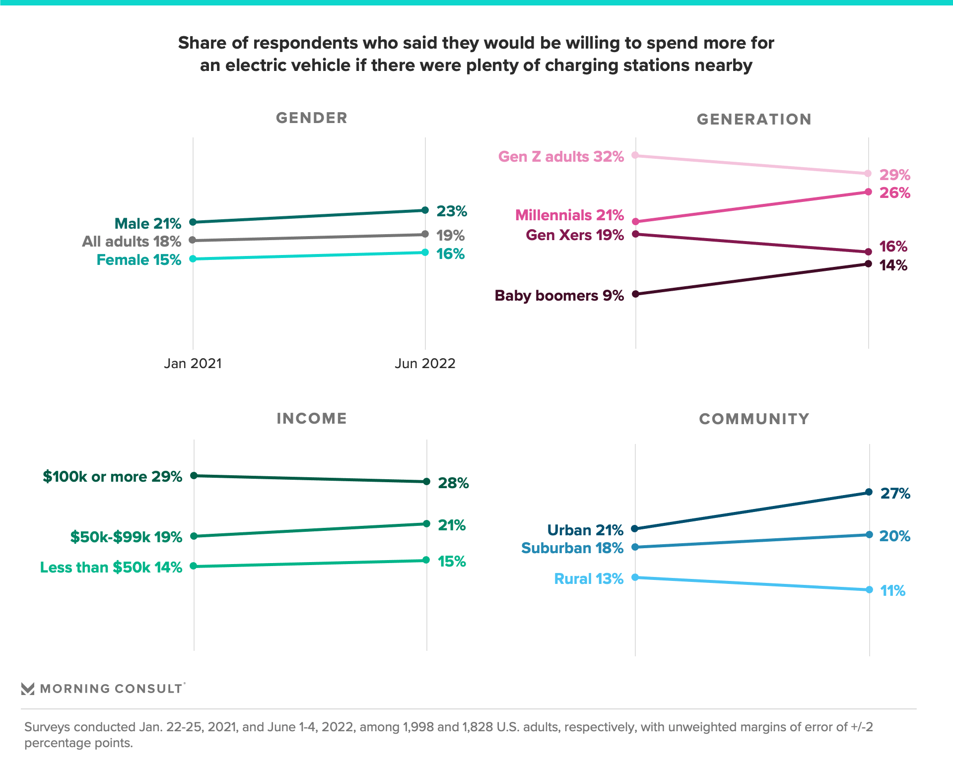 Morning Consult asked consumers if they were willing to spend more for an electric vehicle in a scenario where charging stations access was plentiful. Just a few consumer demographics saw notable gains in the share who said “yes” compared to early 2021 — namely, baby boomers, millennials and those living in urban areas.