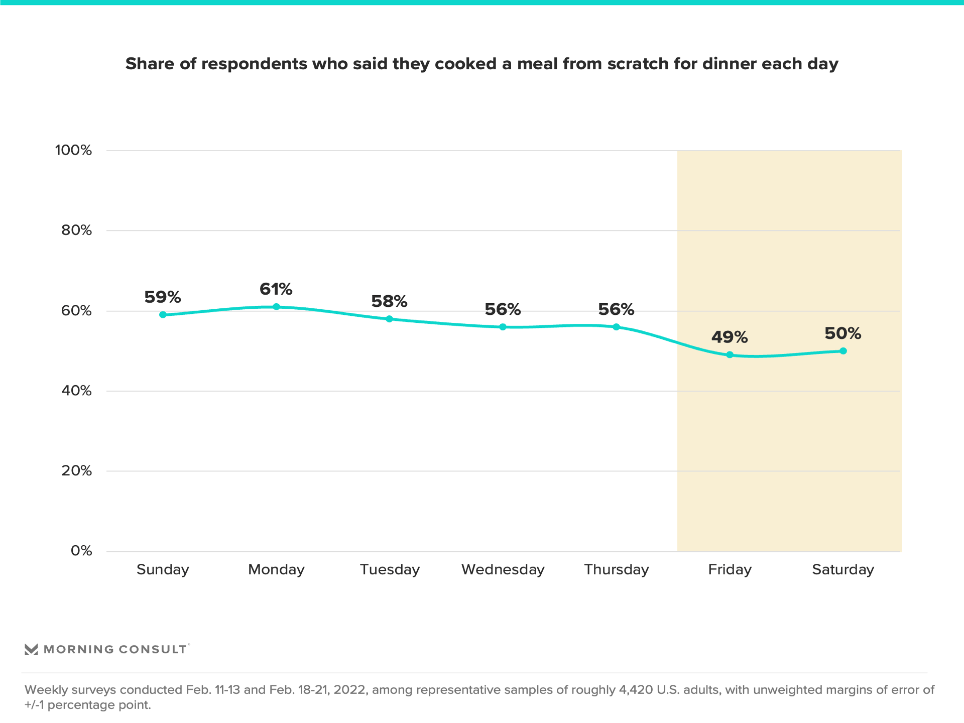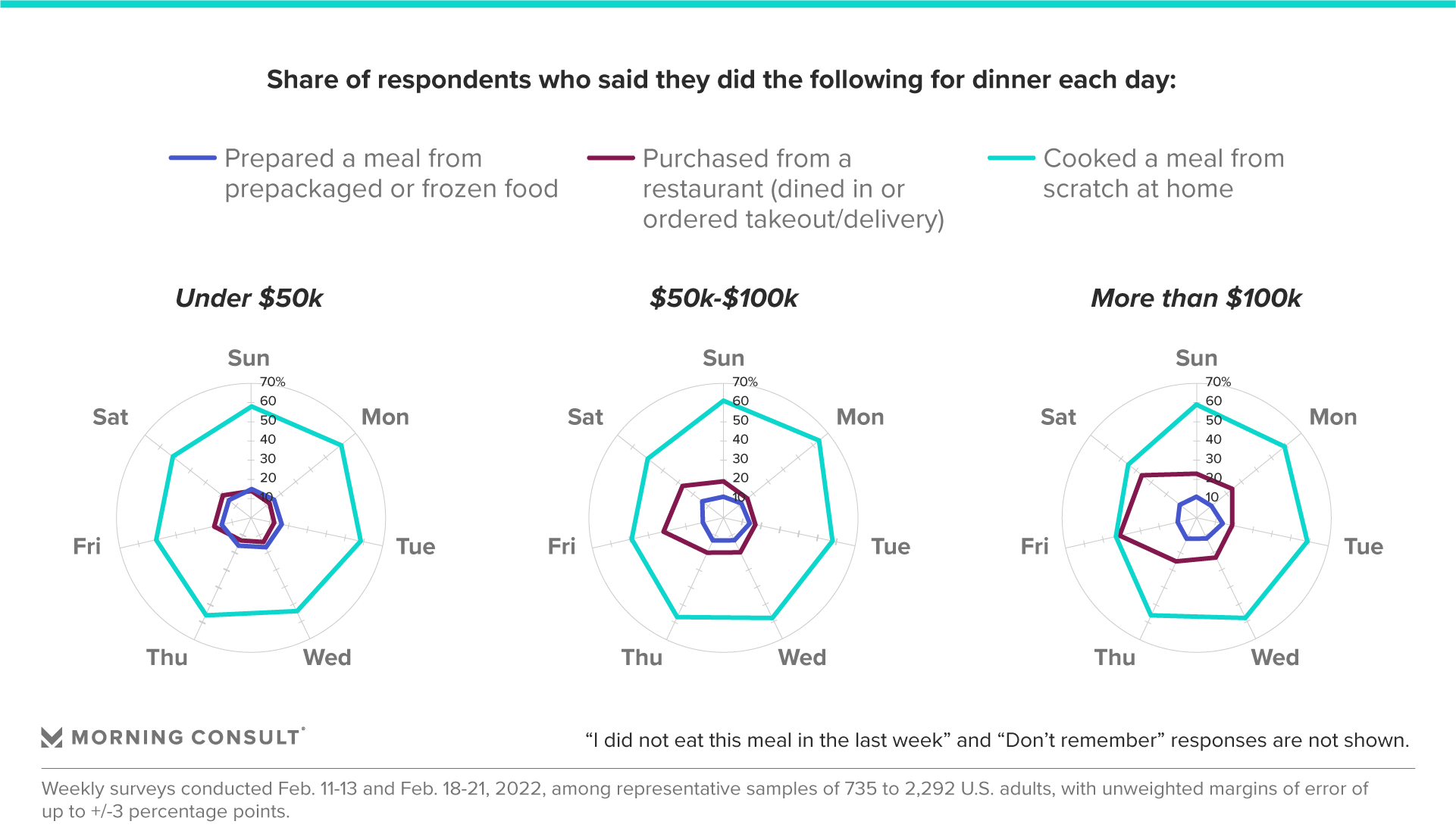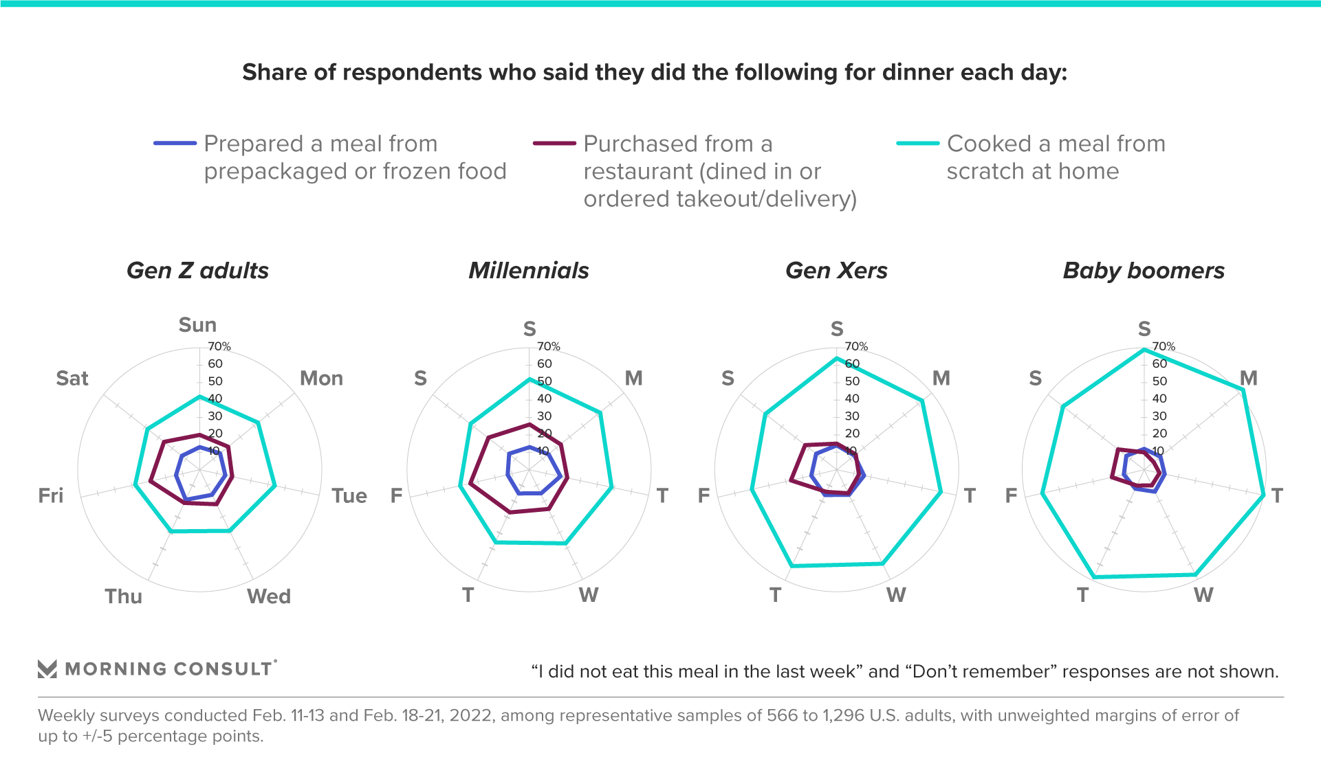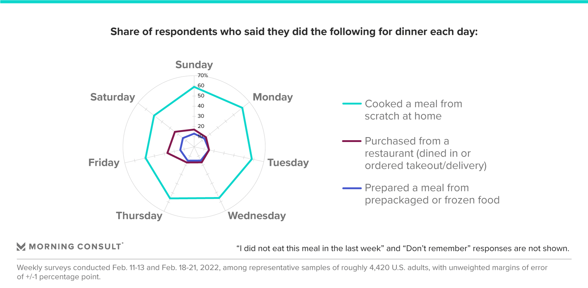 To better understand consumers' current cooking habits, Morning Consult conducted a series of weekly surveys in February 2022 on how people are eating and preparing food. This research is part of a collection. Stay tuned for more.