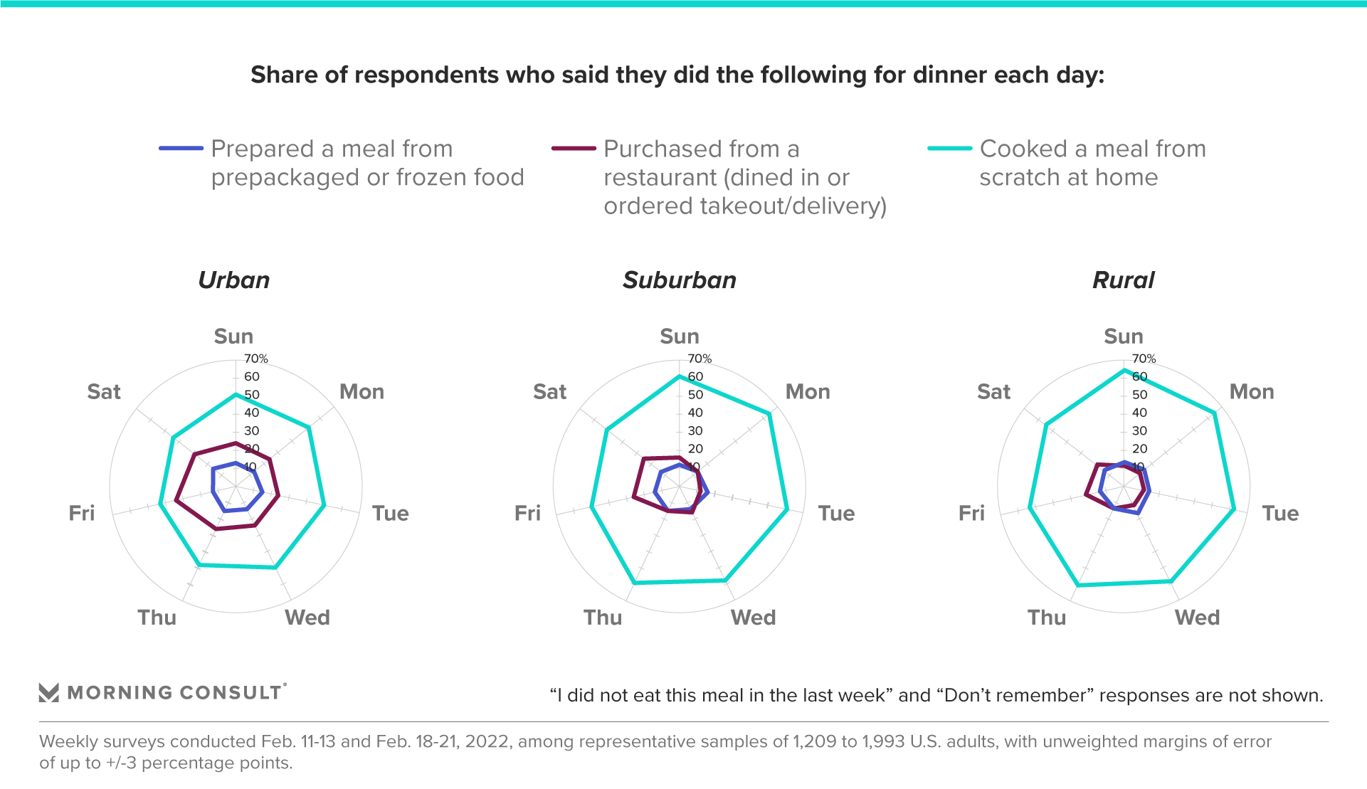Looking at community, urban consumers are roughly twice as likely to get dinner from a restaurant on weeknights as rural and suburban residents. A similar share of suburban and rural consumers cook dinners throughout the week, but suburban consumers are slightly more likely than rural ones to get restaurant food on Fridays and Saturdays.
