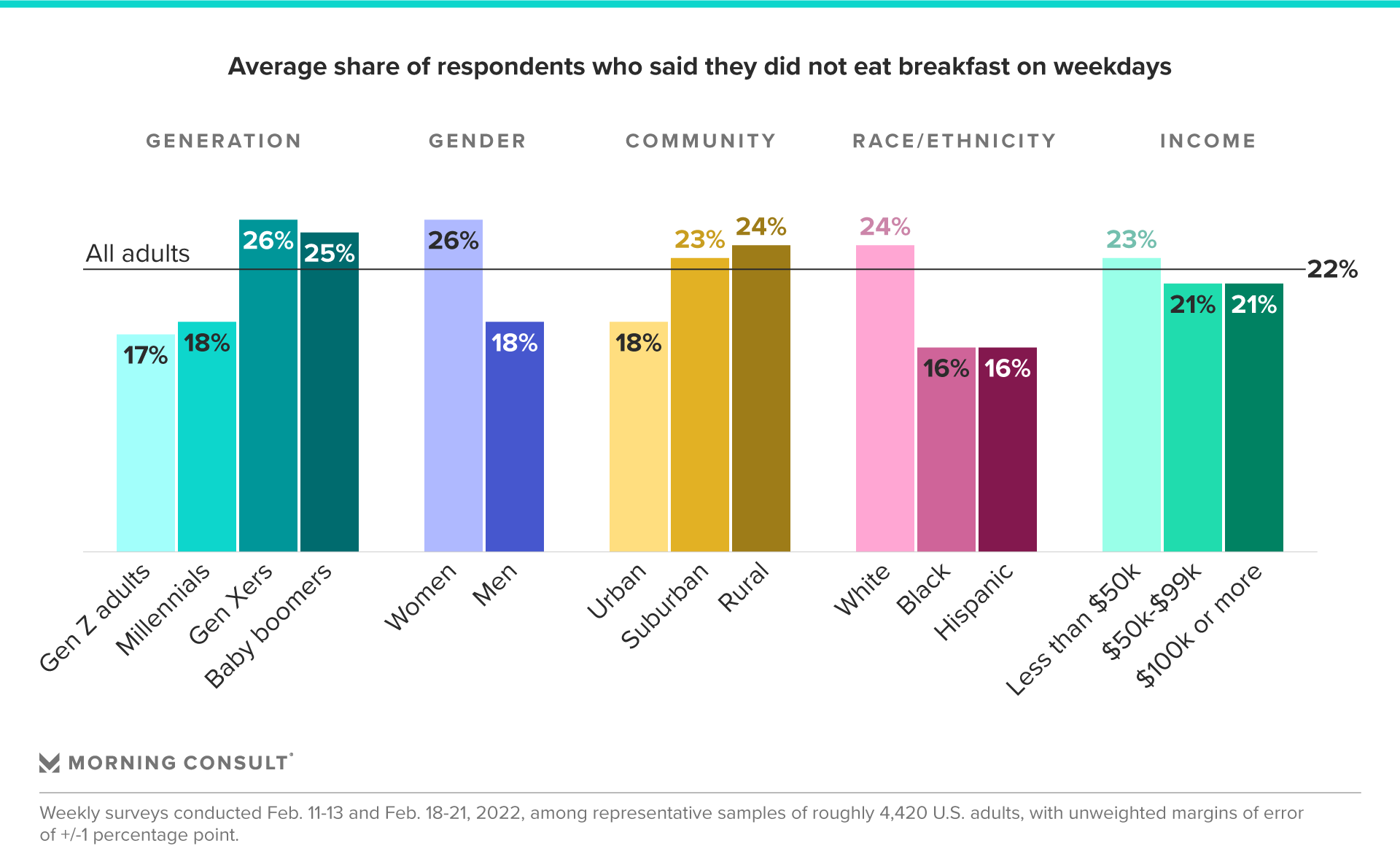 Around half of adults say they cook a meal from scratch at home for breakfast or lunch every day of the week. Breakfast is the meal consumers are most likely to skip: Around 1 in 5 people say they skip breakfast each day. Gen Xers, baby boomers, women, suburban and rural consumers, and white adults are the most likely to forgo breakfast. Differences across income levels are minimal.