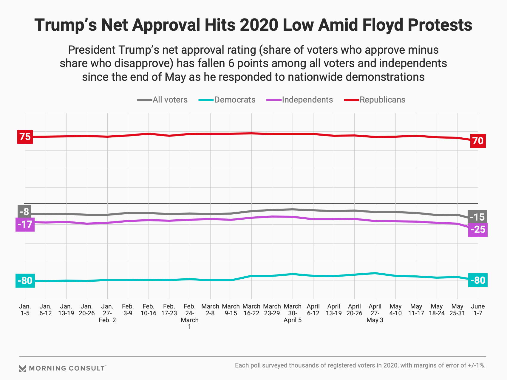 Along with a slump in Trump’s overall approval, a separate Morning Consult poll, conducted June 5-7, found 54 percent of voters disapprove of his handling of the spread of coronavirus in the United States, while 41 percent approve, his worst marks since tracking on the subject began in February.