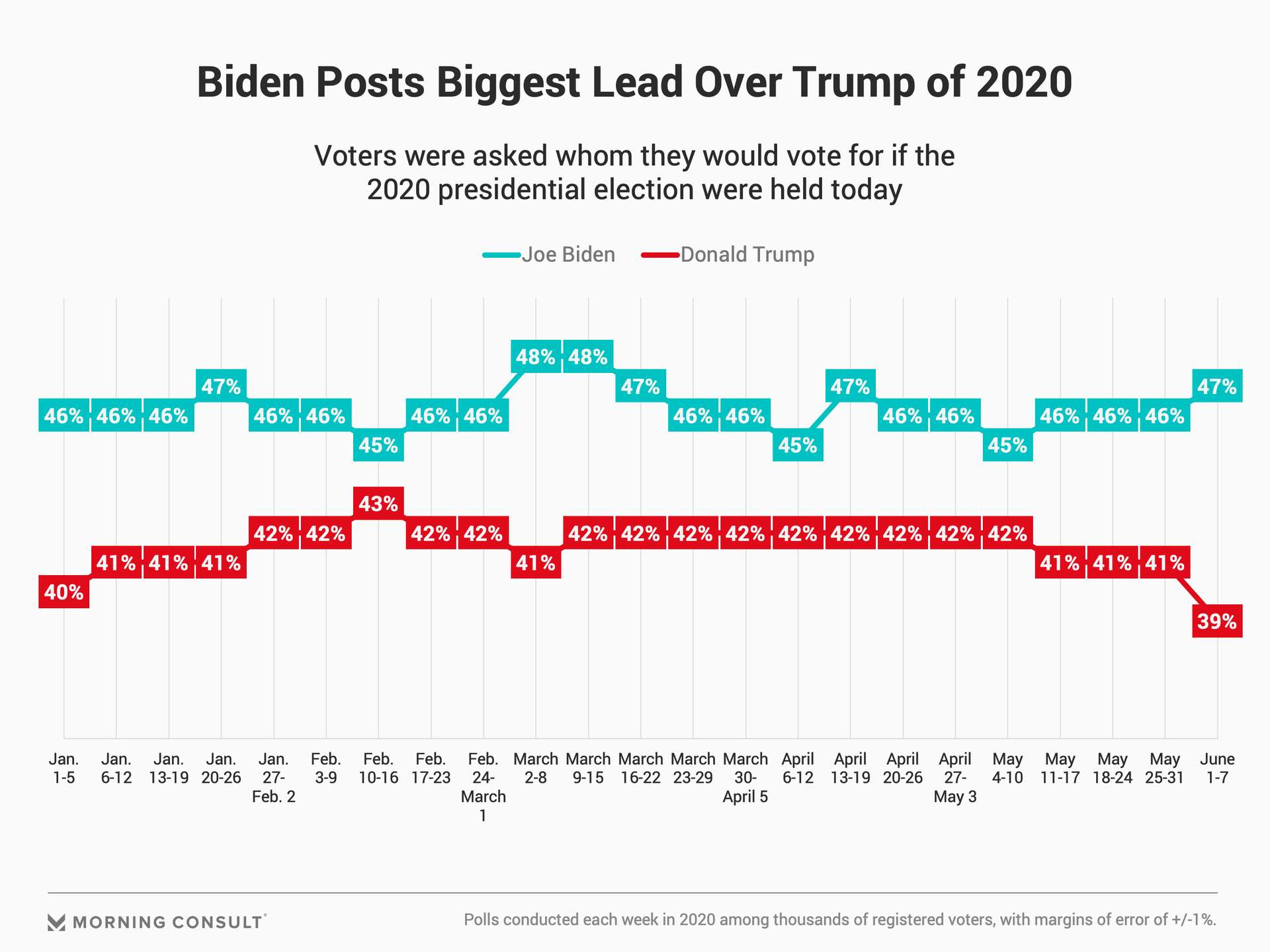 A new Morning Consult poll found that the presumptive Democratic nominee leads Trump by 8 percentage points, 47 percent to 39 percent -- the widest lead recorded this year in weekly tracking of the presidential race. The June 1-7 poll surveyed 32,380 registered voters, with a 1-point margin of error.