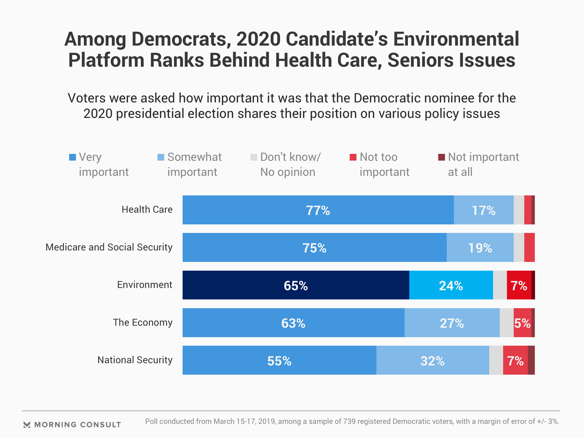 Recent Morning Consult/Politico polling conducted from March 15-17 among 739 registered Democrats showed that about two in three Democrats (65 percent) consider it very important that the Democratic nominee for the 2020 presidential election share their position on environmental policy. That percentage is even higher than the number of Democrats who said the same about the economy and national security, but lower than health care, Medicare and Social Security.