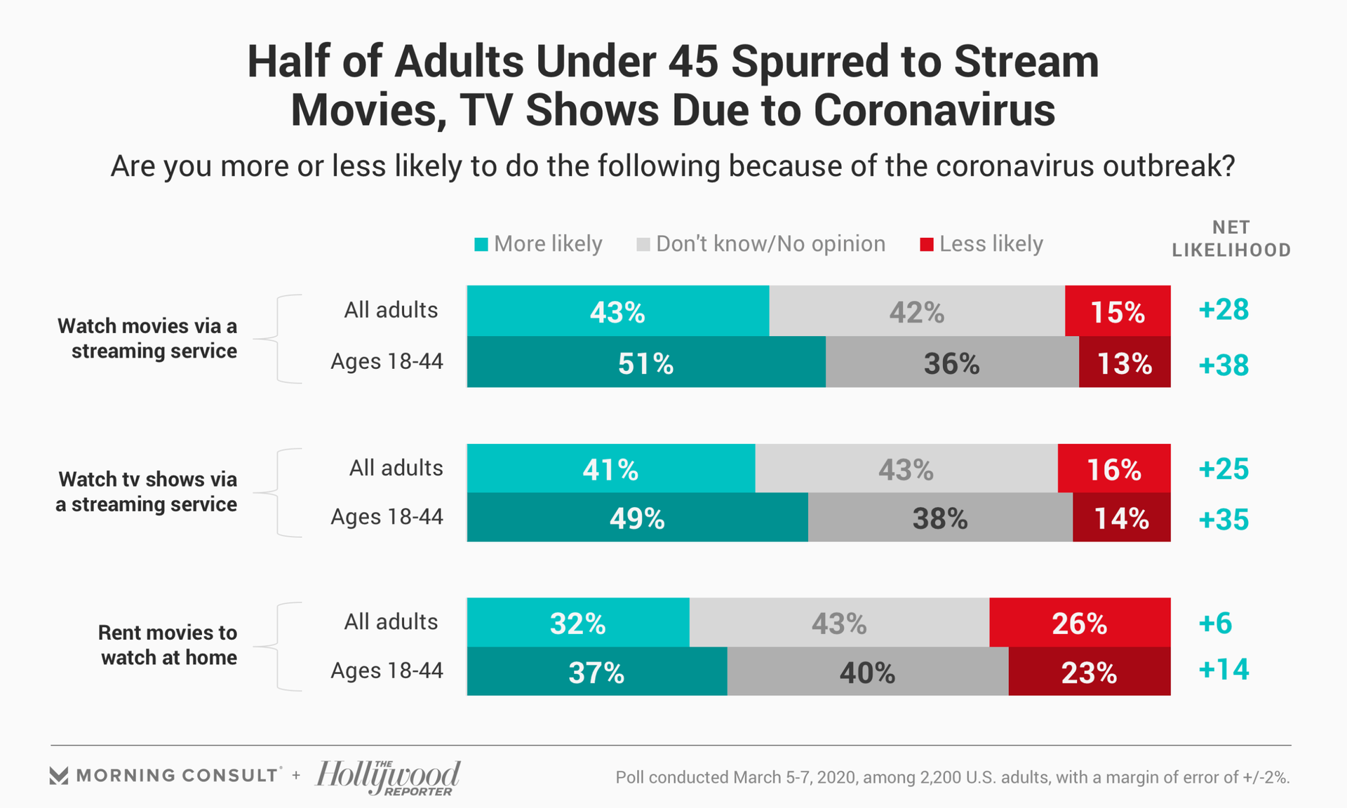 But the interest in renting movies did not match enthusiasm for streaming content: Thirty-two percent of all adults, as well as 37 percent of adults under the age of 45, said they would be more likely to rent movies to watch at home because of the coronavirus outbreak, while 43 percent of the public was unsure.