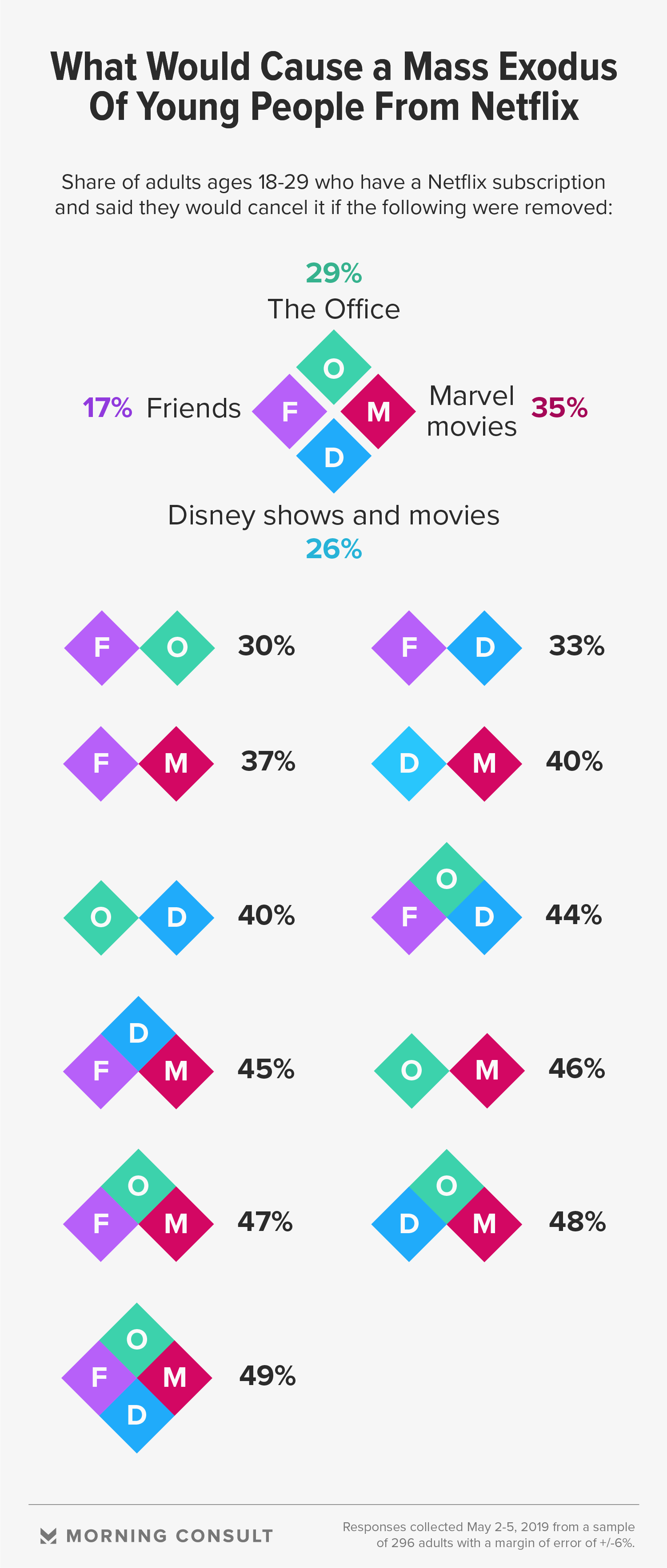 A May 2-5 Morning Consult/The Hollywood Reporter poll found that among Netflix subscribers ages 18-29, nearly half (49 percent) of them would cancel Netflix if “The Office,” “Friends,” Marvel movies and Disney content were all removed from the service -- compared to 32 percent of all 1,085 subscribers who said the same. The margin of error for the sample of all subscribers was 3 percentage points, while the subsample’s margin of error was 6 points.