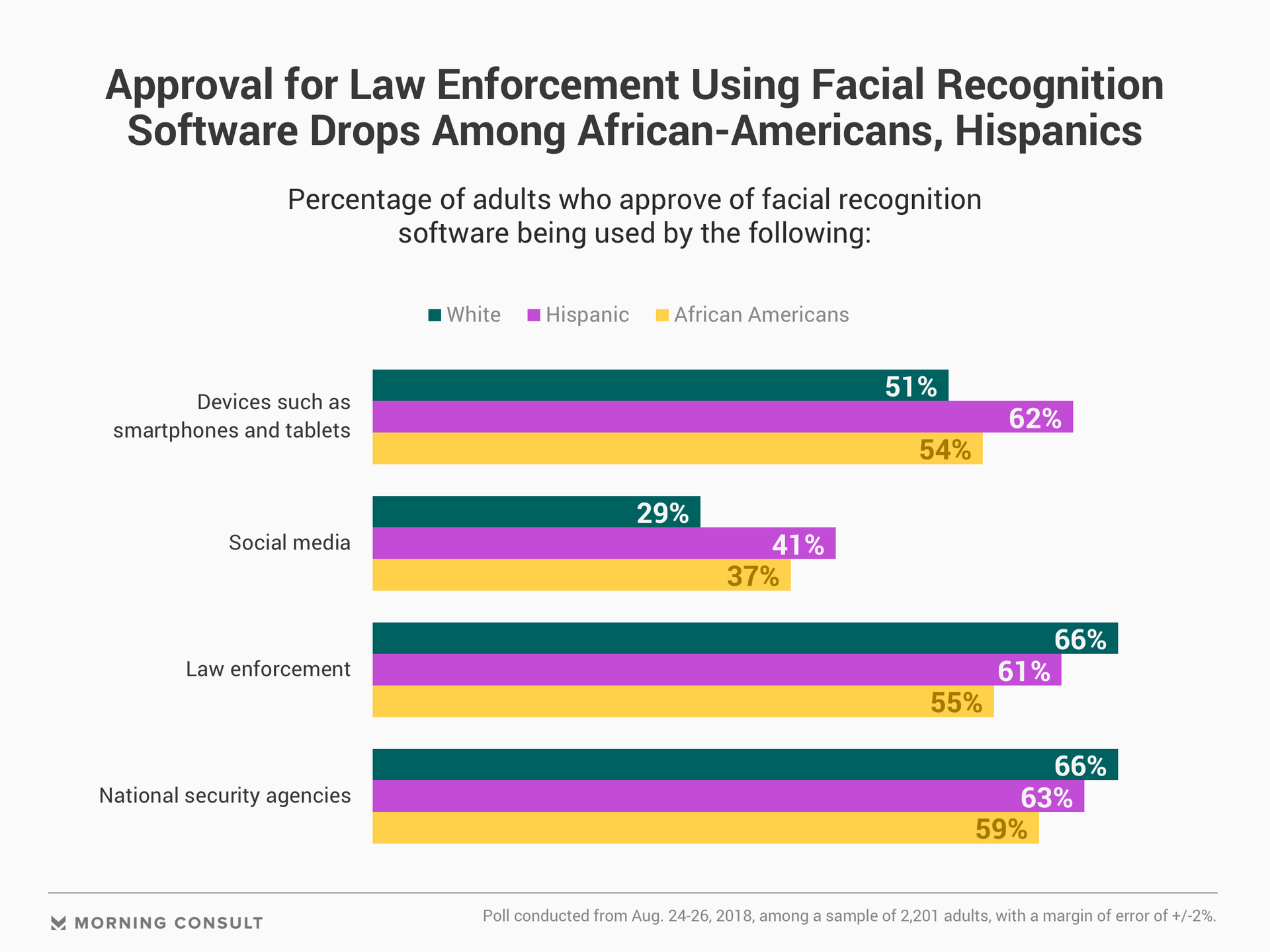 Forty-seven percent of all adults support the use of facial recognition software generally, while 23 percent oppose using the tool. While African-American opposition is relatively similar at 24 percent, opposition among Hispanics, at 33 percent, is 10 percentage points higher than that of all adults. The poll has a margin of error of 2 points.