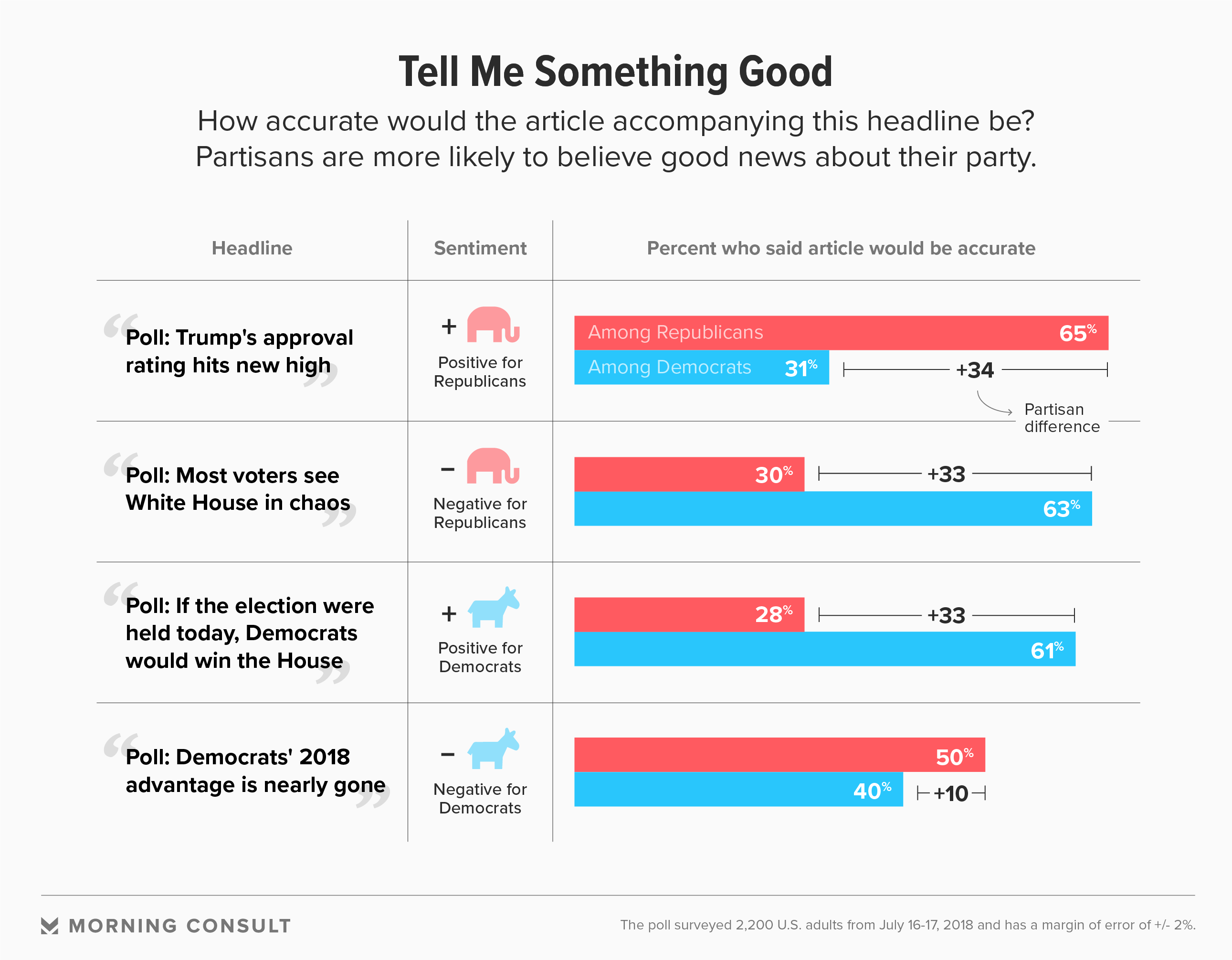 The survey found that a poll that reported negative results for Democrats was the least politically divisive: Half of Republicans and 40 percent of Democrats said the polling headline “Poll: Democrats' 2018 advantage is nearly gone” was accurate.