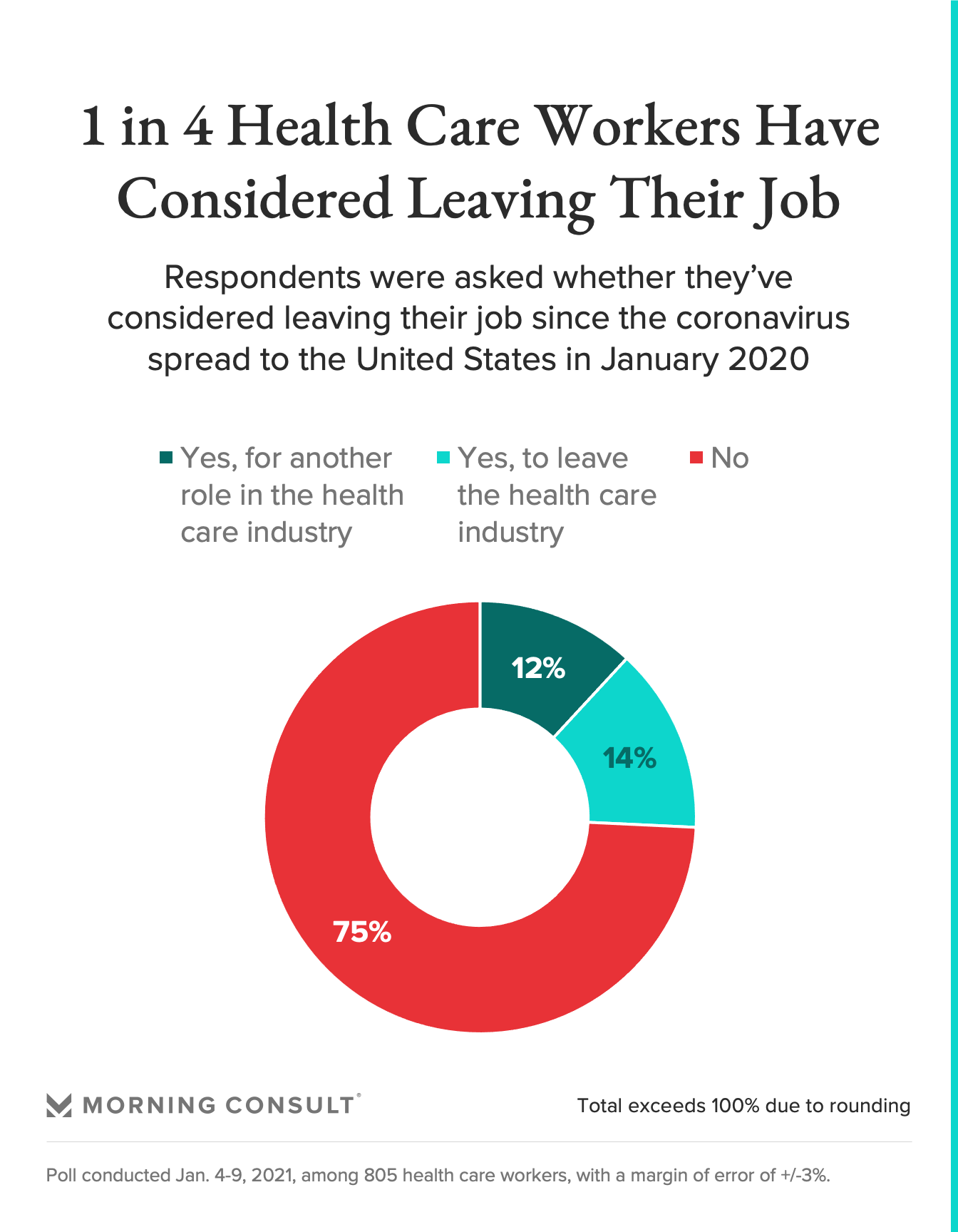 A new Morning Consult survey found that 26 percent of U.S. health care workers have considered leaving their job since the pandemic spread to the United States last January. Included in that share are 14 percent who say that COVID-19 has left them thinking that they might leave the health care profession altogether.