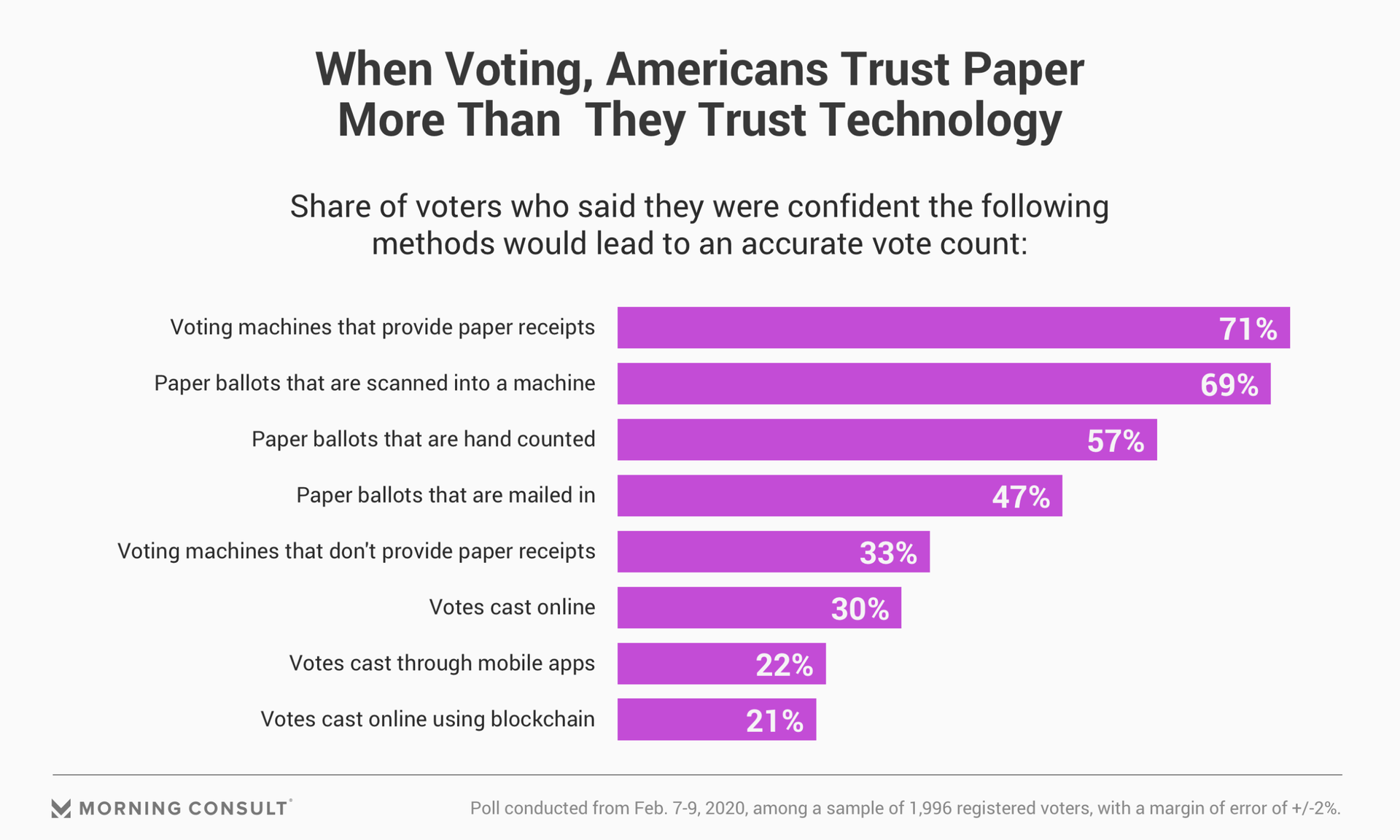 In the survey, voters were more likely to trust methods that involved paper than those that relied on technology. Hand-counted paper ballots and mail-in votes came in at 57 percent and 47 percent respectively, compared to 21 percent of voters who had some confidence in blockchain-enabled systems to count their vote. Voters across party lines were inclined to answer in the same way.