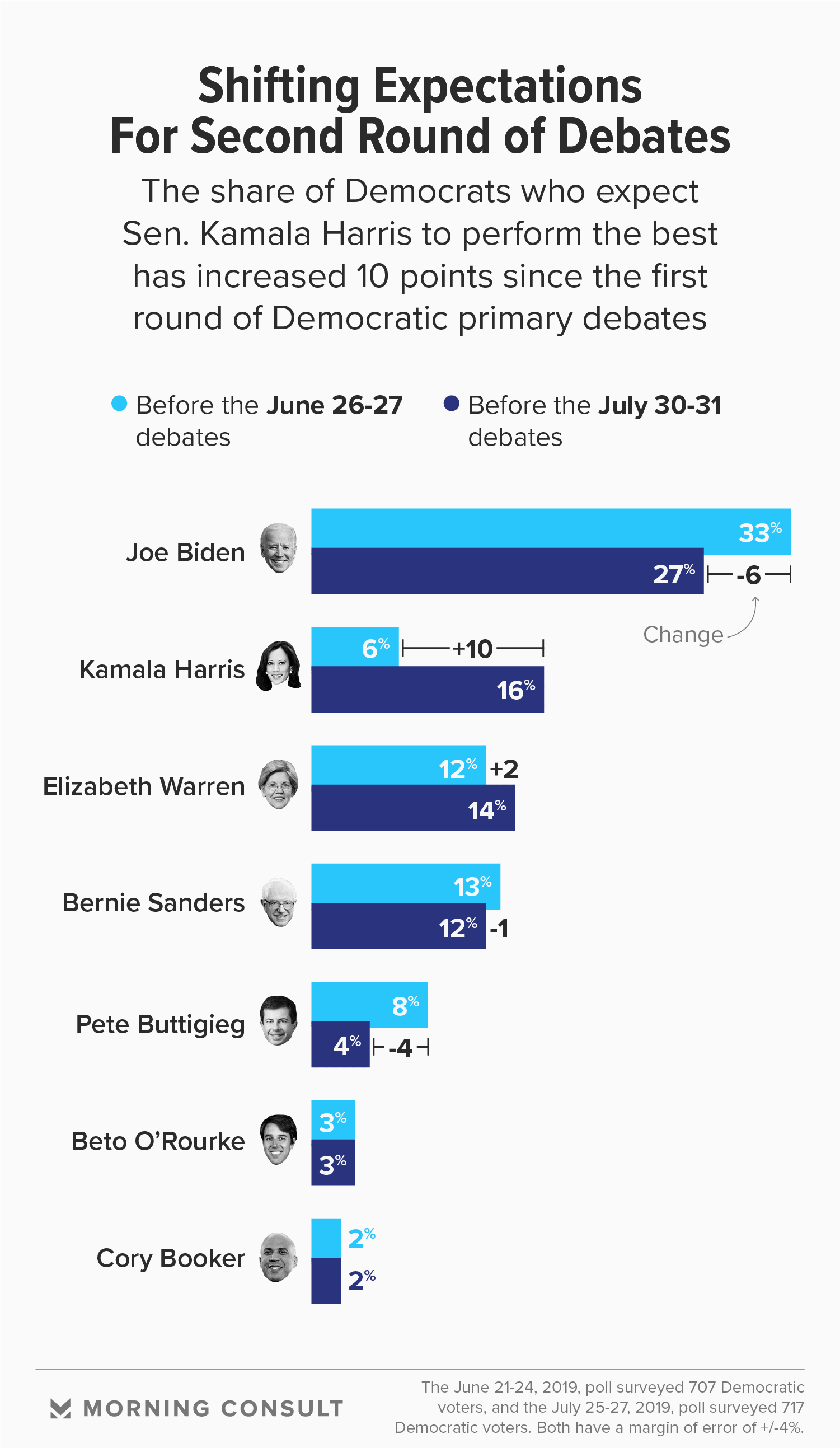 Biden still faces the highest expectations, with 27 percent of Democratic voters expecting him to shine during the debates. But that figure dropped 6 points compared to the survey conducted before the first set of debates.