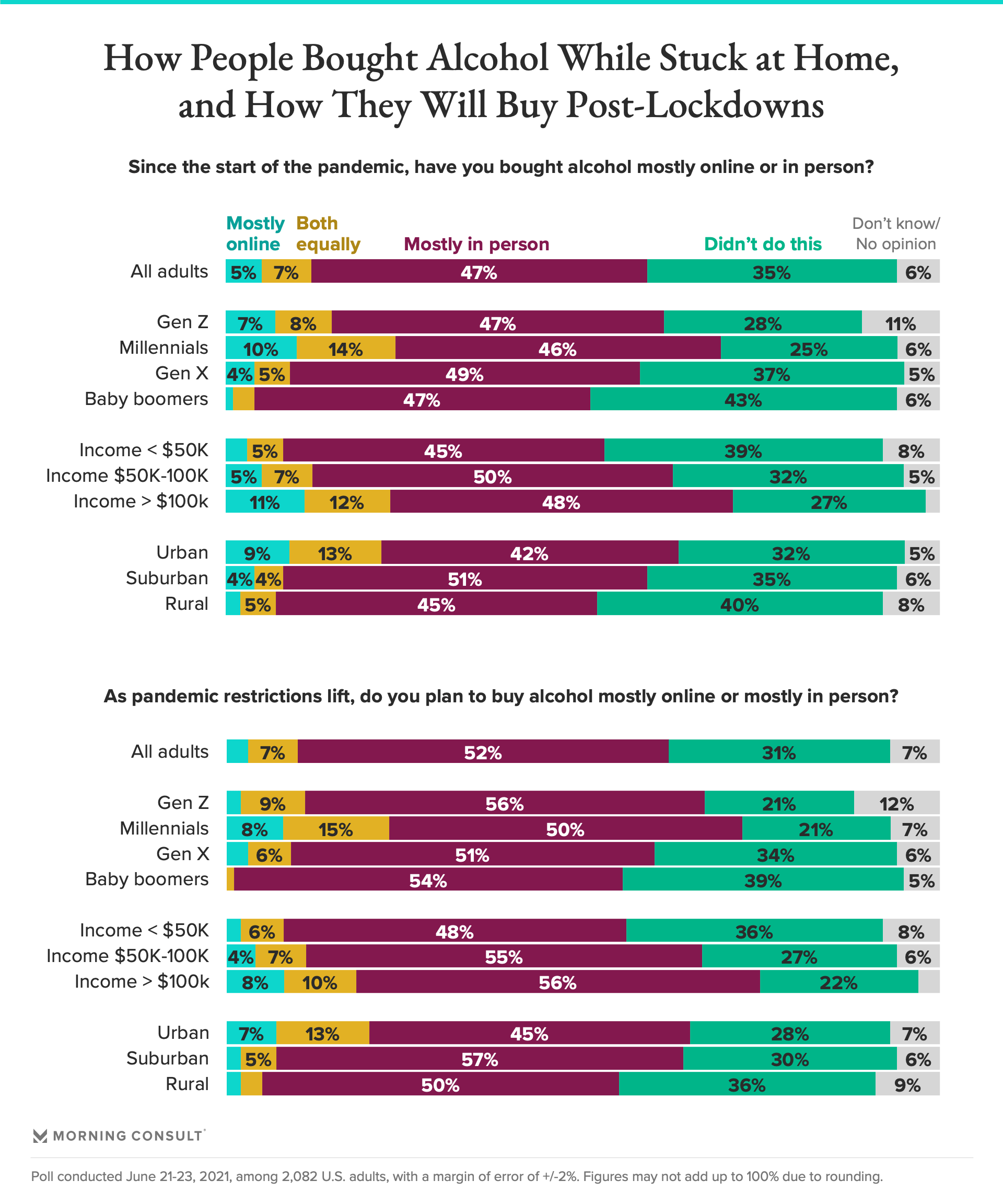Still, in-person purchases was by far the most popular way for consumers to procure their alcohol since the start of the pandemic, at 47 percent, with significantly smaller shares of people saying they’ve done so primarily online (5 percent), or equally in person and digitally (7 percent).
