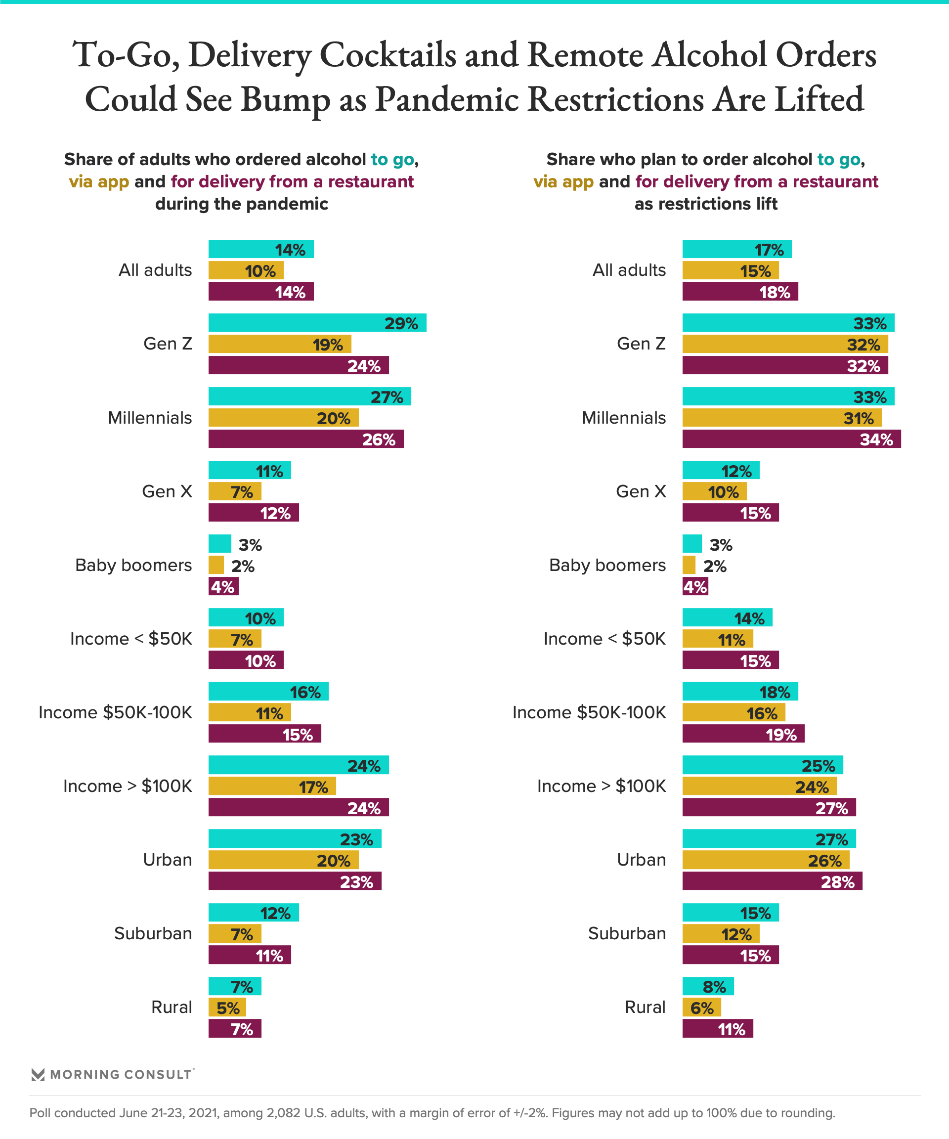 Good news for bars and restaurants that will continue offering to-go drinks: Similar shares of adults plan to opt for to-go cocktails (17 percent) and alcohol delivery from restaurants (18 percent), even as getting in-person drinks becomes a more viable option. Those figures are even higher among Gen Z adults and millennials, high earners and people who live in urban areas.