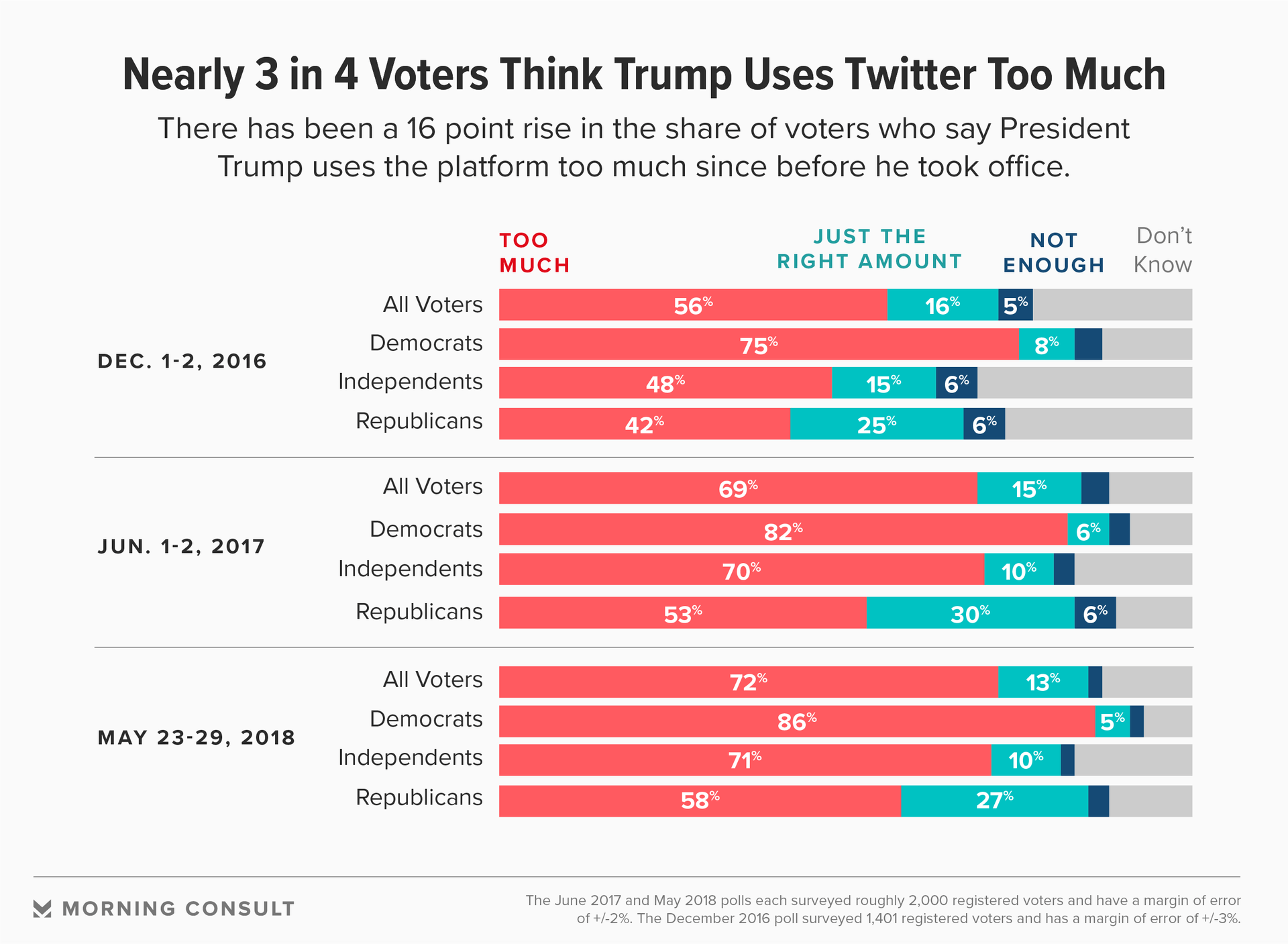 A Morning Consult/Politico survey of 1,995 registered voters from May 23-29 found 72 percent of respondents said Trump uses the social media platform too much, up 16 percentage points from a December 2016 poll.