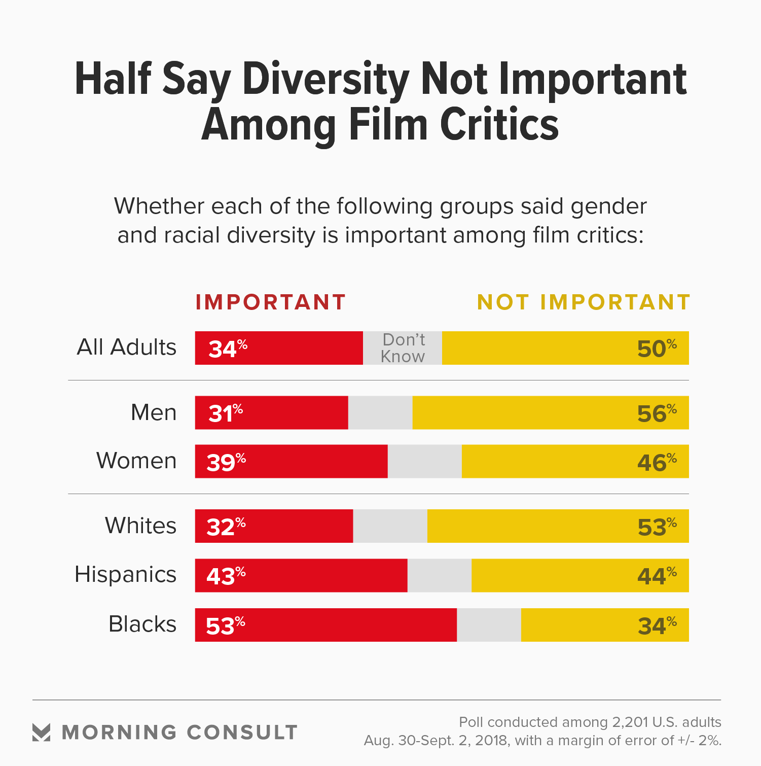 New Morning Consult polling shows the public is more likely to say gender and racial diversity among film critics is not important (50 percent) than to say it is (34 percent).