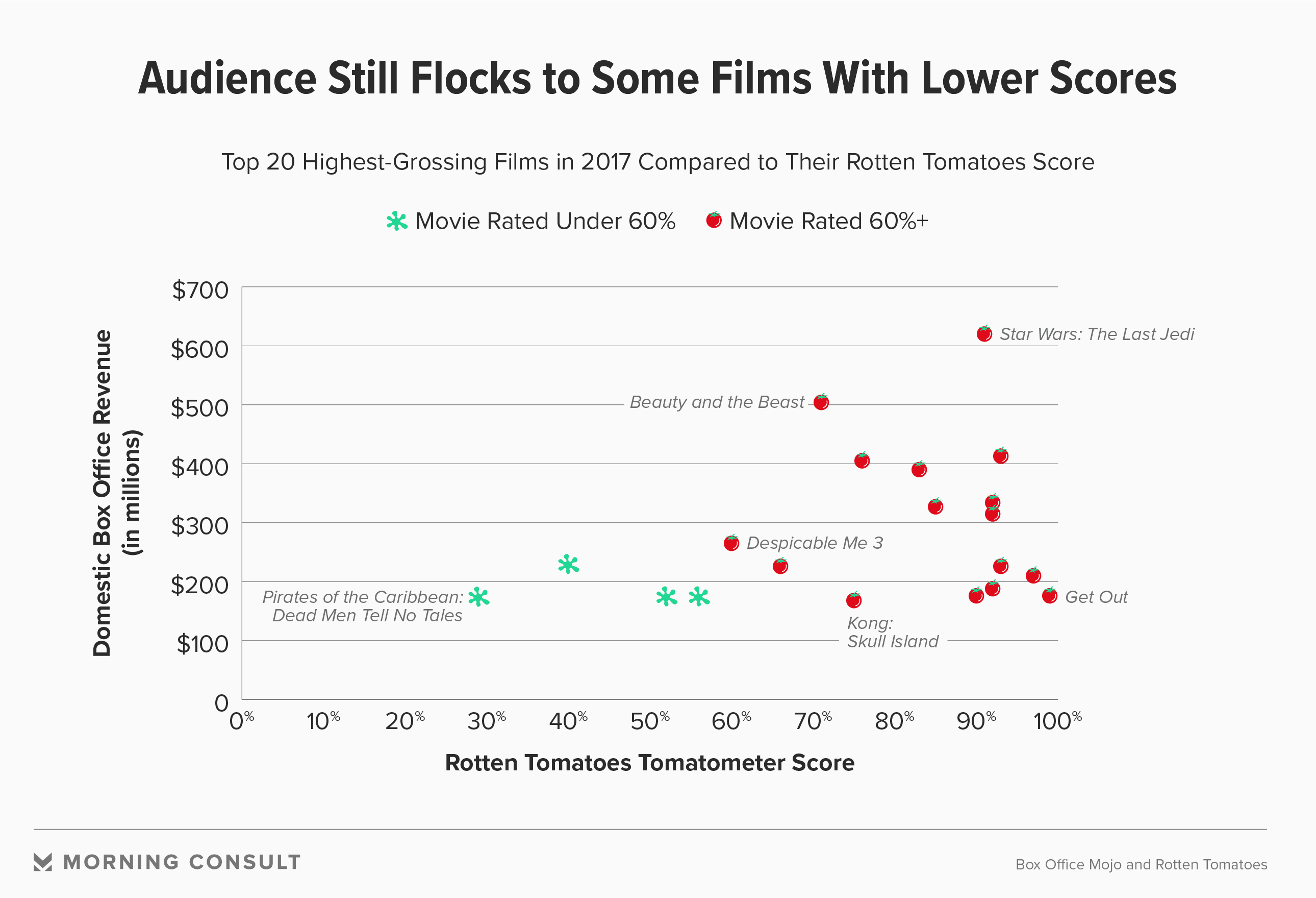 Last year’s 20 highest-grossing films in the United States have Rotten Tomatoes critic scores ranging from 29 percent (for “Pirates of the Caribbean: Dead Men Tell No Tales”) to 99 percent (for “Get Out”).