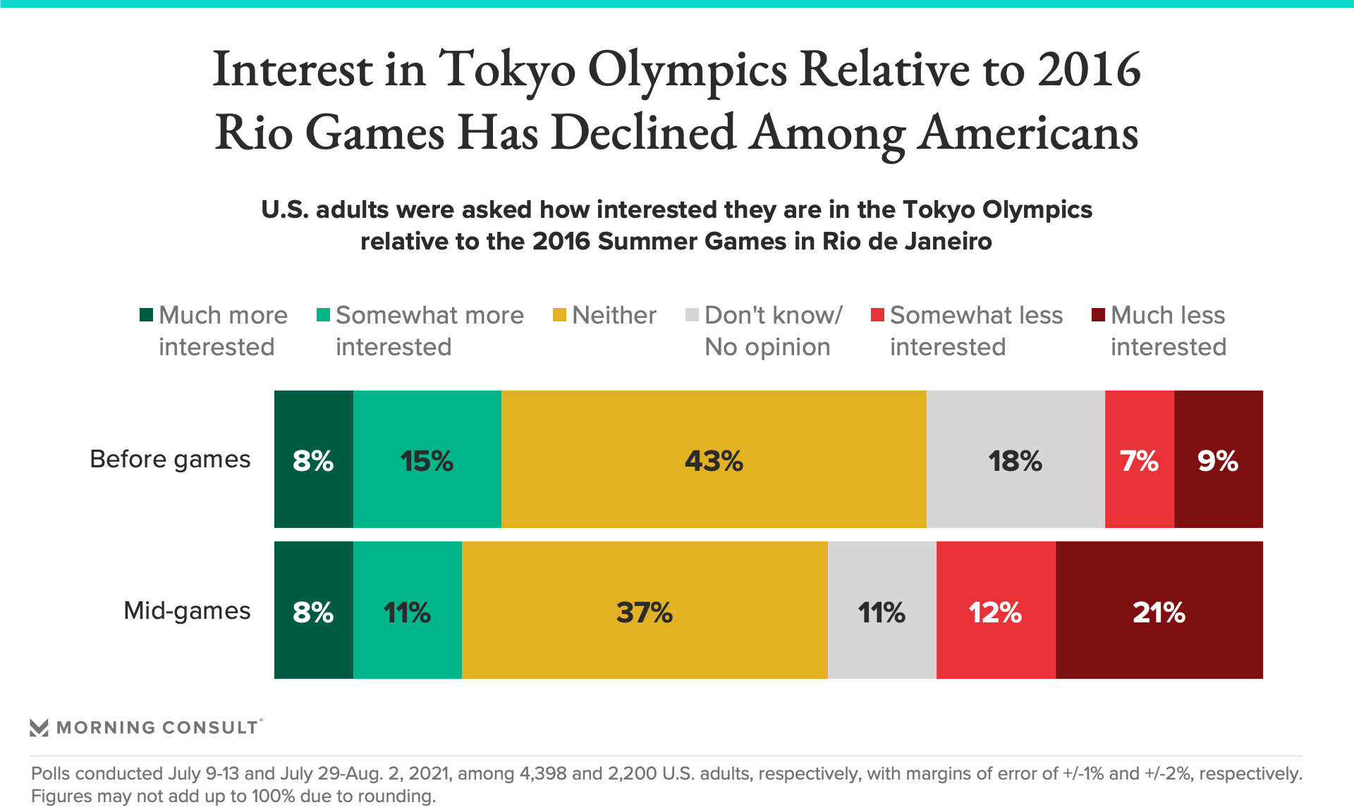 In fact, a comparison of Morning Consult surveys conducted prior to the Tokyo Games and after the first week of action suggests U.S. adults are less interested in and watching less of this summer’s Olympics than they anticipated.