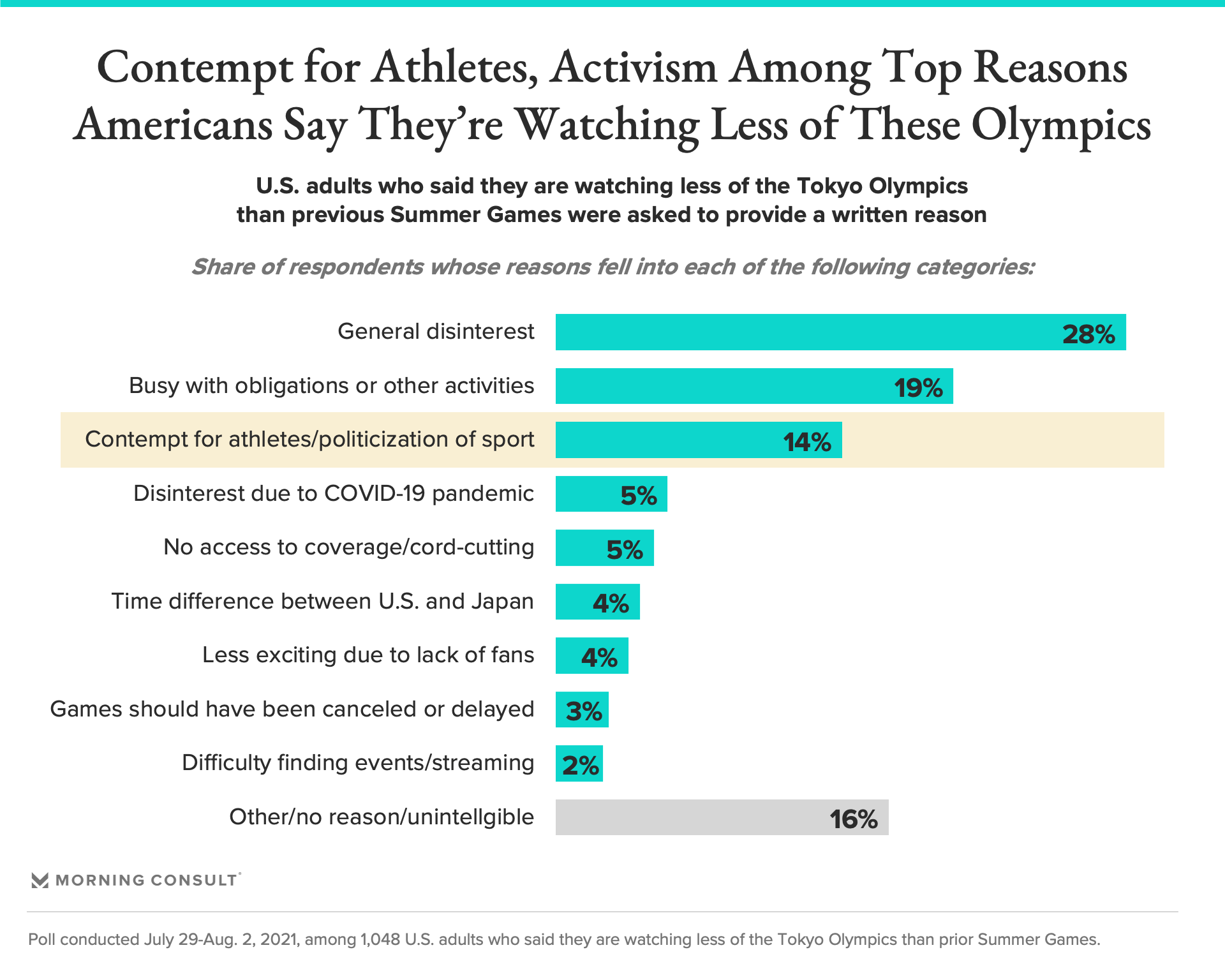 The share of respondents who attributed their decline in viewership to politics and protest is notable given that the first week of the Tokyo Games featured only a few examples of athlete activism, indicating that this concern is based more on previously held expectations rather than events on the ground.