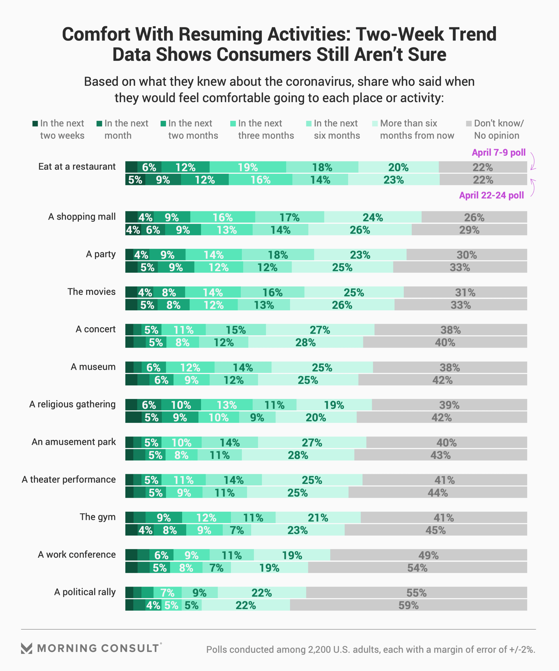Morning Consult asked when U.S. adults would feel safe doing a range of activities, from eating out at restaurants to going to the gym. The April 22-24 questions were trended from an April 7-9 survey, to see if and how attitudes have changed.