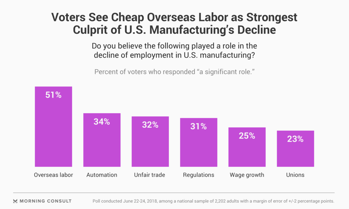 Fifty-one percent of respondents said they think inexpensive overseas labor has played a significant role in the decline of U.S. manufacturing, while smaller shares of respondents blamed unfair trade practices, automation and regulations.