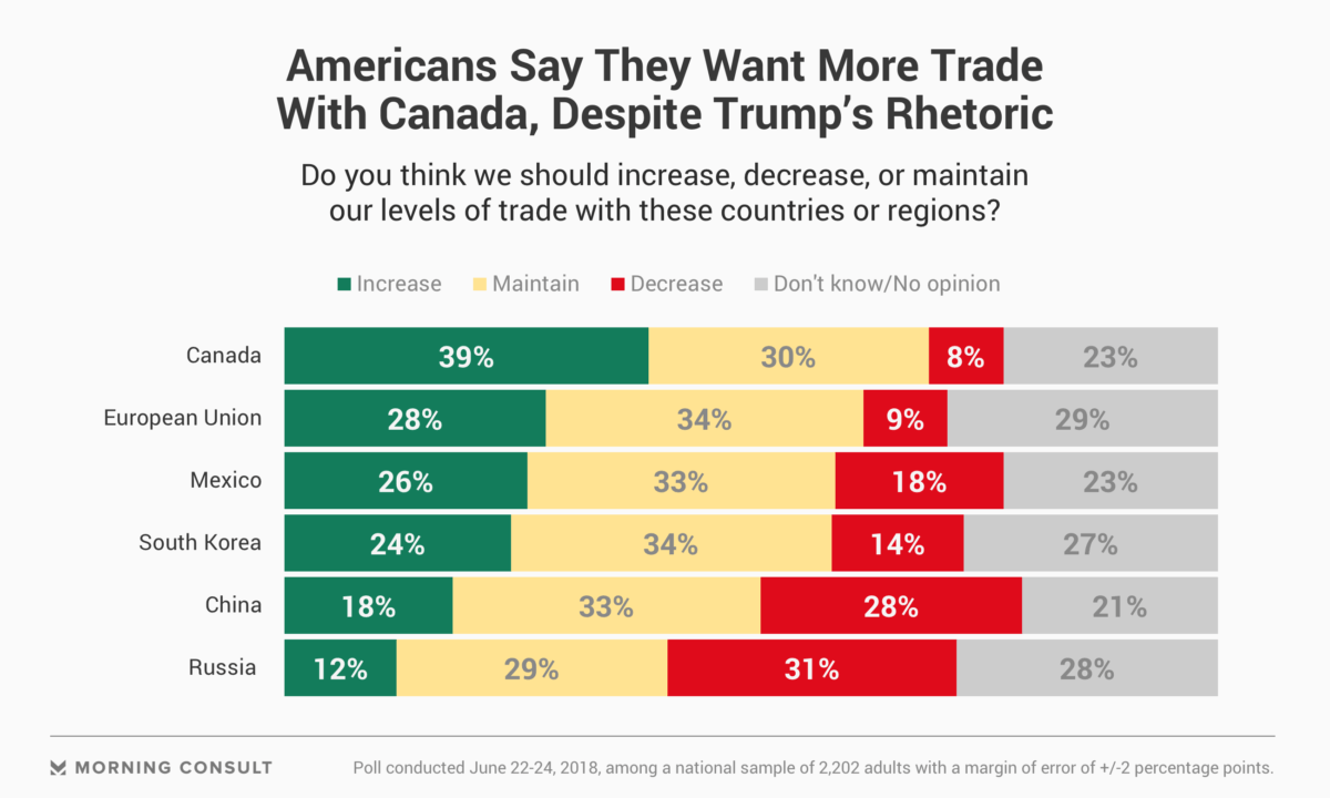 The survey was conducted among a sample of 2,202 adults after the June 8-9 Group of Seven summit of major industrial nations, at which President Donald Trump doubled down on his administration’s aggressive trade policy toward traditional allies like Canada. The Trump administration moved forward June 1 with tariffs of 25 percent and 15 percent on steel and aluminum, respectively, from Mexico, Canada and the EU.