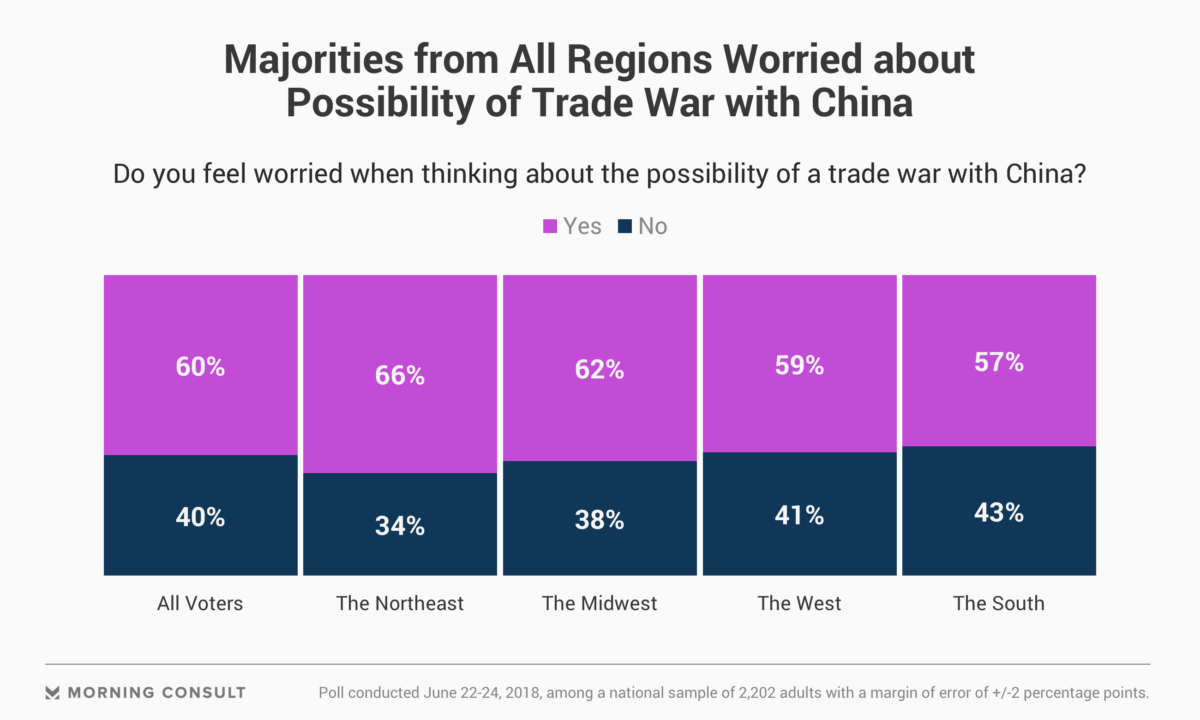 Anxiety about a potential trade war was prominent across the country: The Northeast, with 66 percent of respondents, had the largest share by region of Americans saying they’re worried about a trade war, while the South had the smallest share with 57 percent.
