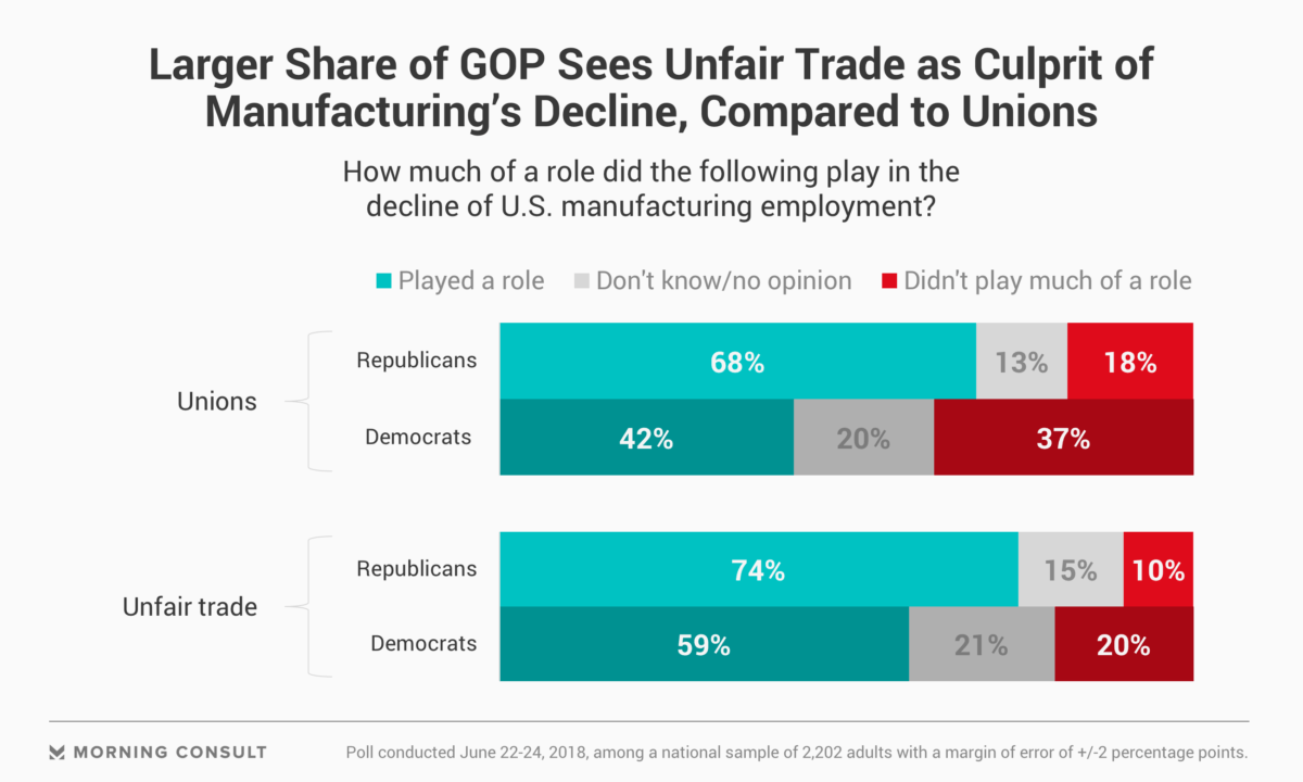 But while Republicans, at 36 percent, were more likely than Democrats, at 16 percent, to say that unions played a role in the loss of manufacturing jobs, a 43 percent plurality of GOP respondents blamed unfair trade practices.